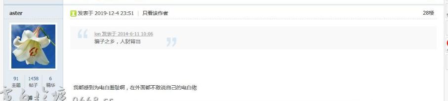 cz752 大学三年级 注册 2019-12-20 消息 802 反馈评分 94 点数 11 2020-04-19 #145 txn 说: 到底是怎么回事?给个链接看看。我很喜欢看天涯老师的文章,让你这样搞,我没得看了。 点击展开... 在茂名论坛有条好几年前的电诈贴专门唱衰电白人,这条陈老尸又把那条贴翻出来再唱衰一次,还跑来电白论坛卖乖,这种人问候他全家也不过分啊… 最后编辑: 2020-04-19