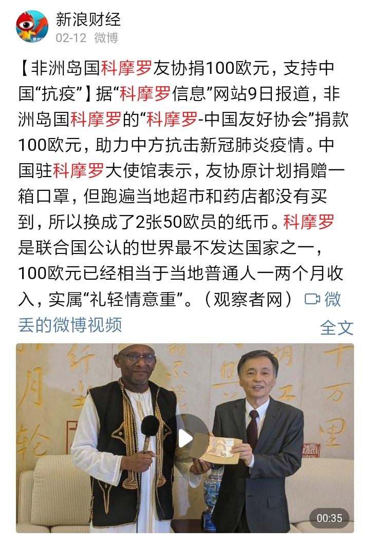 分享 非洲岛国科摩罗为我国抗疫捐款100欧元有感出句 雪中送炭,一百欧元扬百世(汪洋大海)