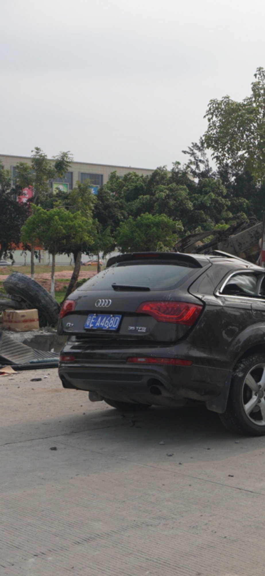 今天下午1点30分,市民大道往茂名大道方向,亿丰门口,一辆搅拌车(车牌:粤K07005)与一辆奥迪Q7 SUV(车牌:粤EA468D)发生碰撞,搅拌车翻车碾压奥迪车,奥迪车司机夫妇当场死亡,现场非常惨烈。