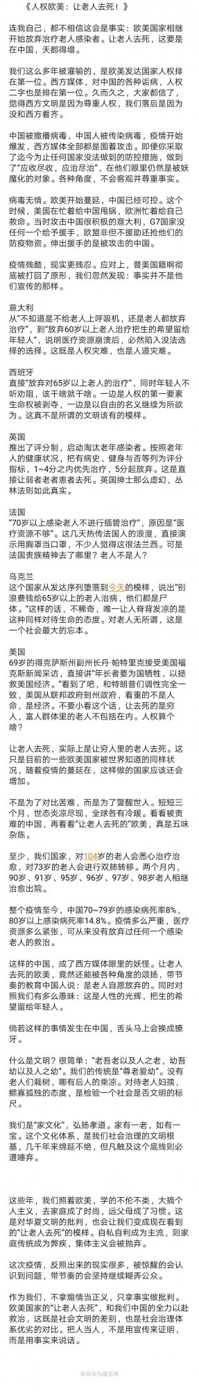 老吾老以及人之老,幼吾幼以及人之幼。从这次疫情可以看出中西方的文明差异。