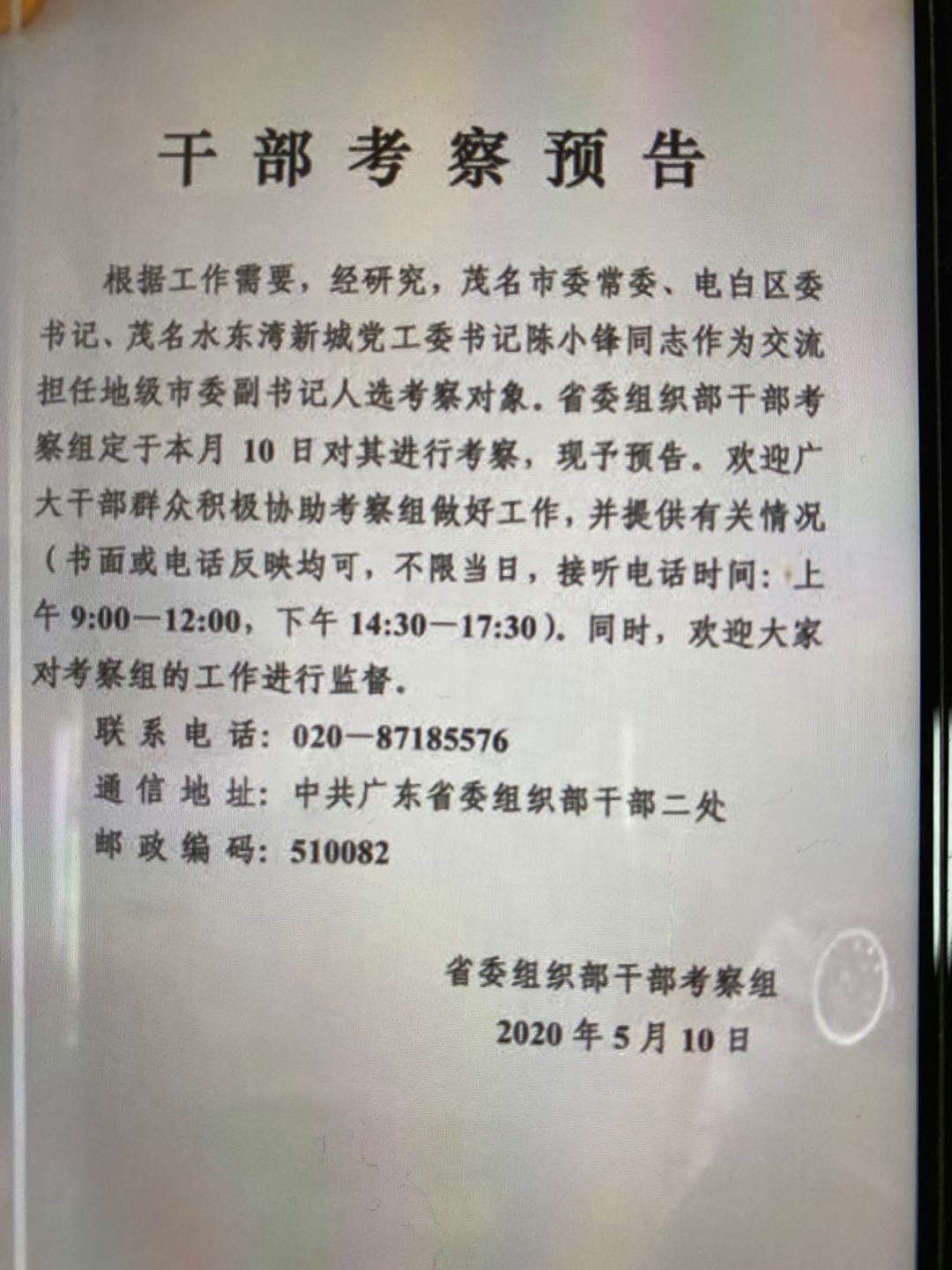 根据工作需要,经研究,茂名市委常委、电白区委书记、茂名水东湾新城党工委书记陈小锋同志作为交流担任地级市委副书记人选考察对象。省委组织部干部考察组定于本月10日对其进行考察,现予预告。欢迎广大干部群众积极协助考察组做好工作。并提供有关情况(书面或电话反映均可,不限当日,接听电话时间:上午9:00-12:00,下午14:00-17:30),同时,欢迎大家对考察组的工作进行监督。