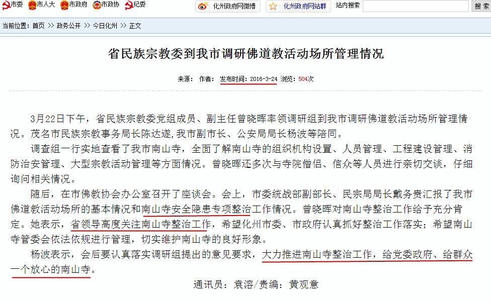 黄亚华以行政权力介入的南山寺,因为属于非法用地、非法建筑、不经验收,更因每天有数千人、高峰时每天超万人慕名而来,从而存在着极大的系列安全隐患。然而,接到了投诉举报的谭剑锋,却利用化州市长的职权,不仅一直瞒上欺下地极力包庇,还斗胆篡改了那份整治南山寺安全隐患的化州市政府会议纪要来蒙骗省调查组。