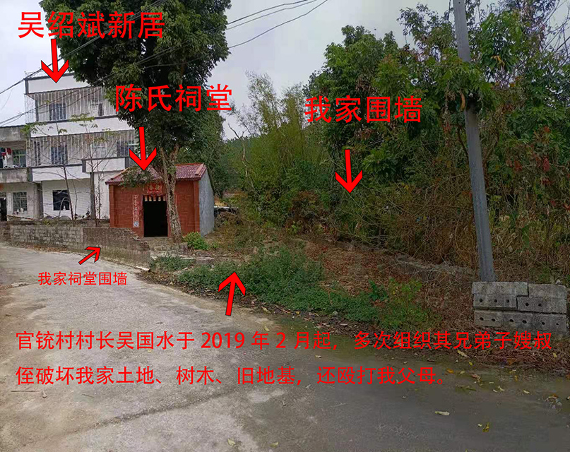 官铳村村长吴国水从2019年2月起,多次组织其兄弟子嫂叔侄破坏我家土地、树木、旧地基,还殴打我父母。