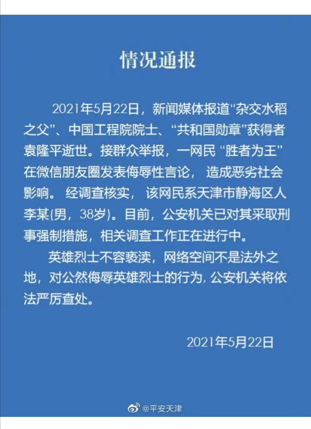 绿城风景 副教授 注册 2018-05-28 帖子 2,015 反馈评分 178 点数 101 2021-05-23 #15 小石龟 说: 脑残,真多 。我就,喜欢颜宁。像电白论坛16年什么院士,还不是小人一个。 点击展开... 天津市静海区网民,李某,38岁,侮辱袁隆平院士被打执行强制措施。