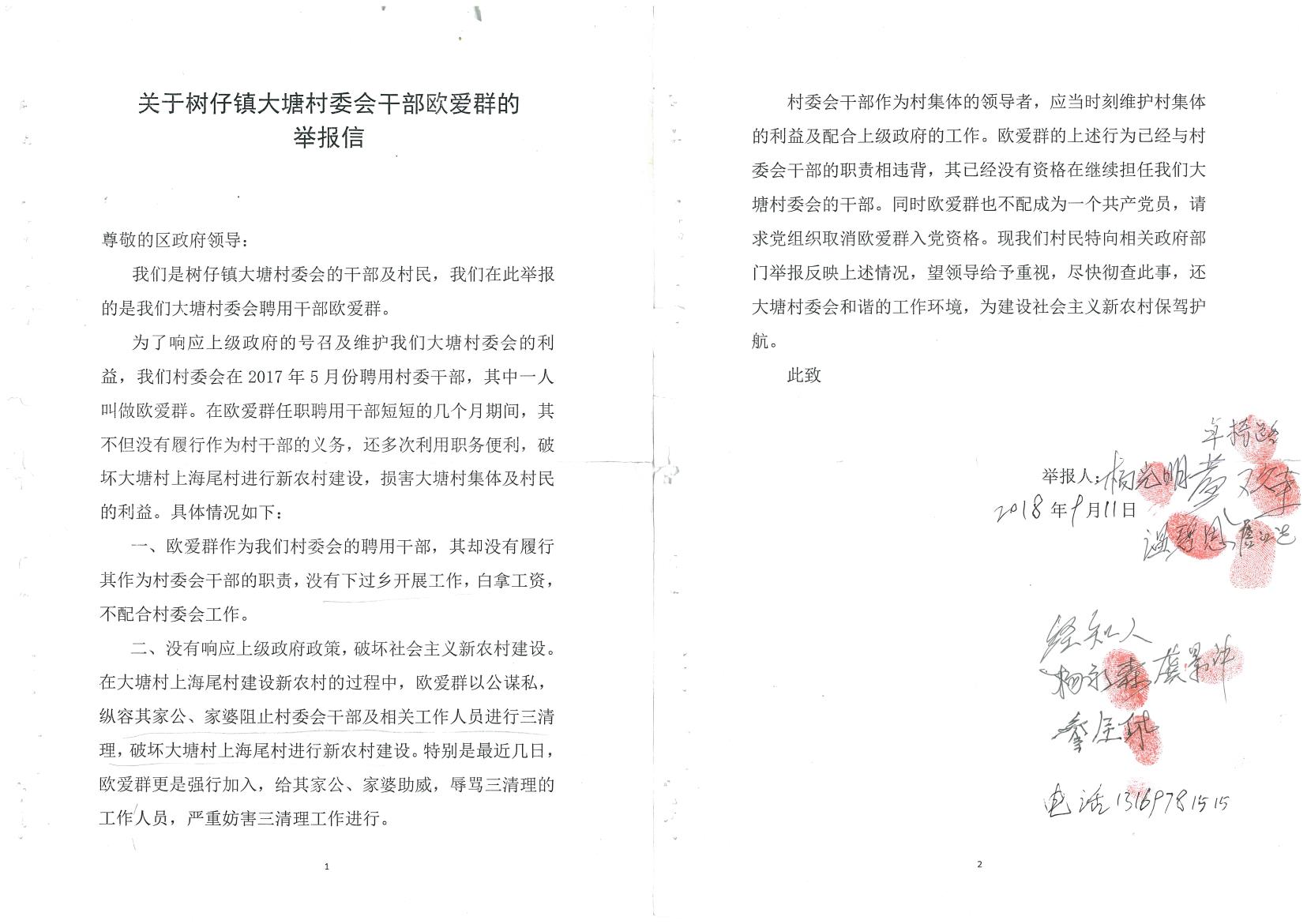 关于树仔镇大塘村委会干部欧爱群的举报信