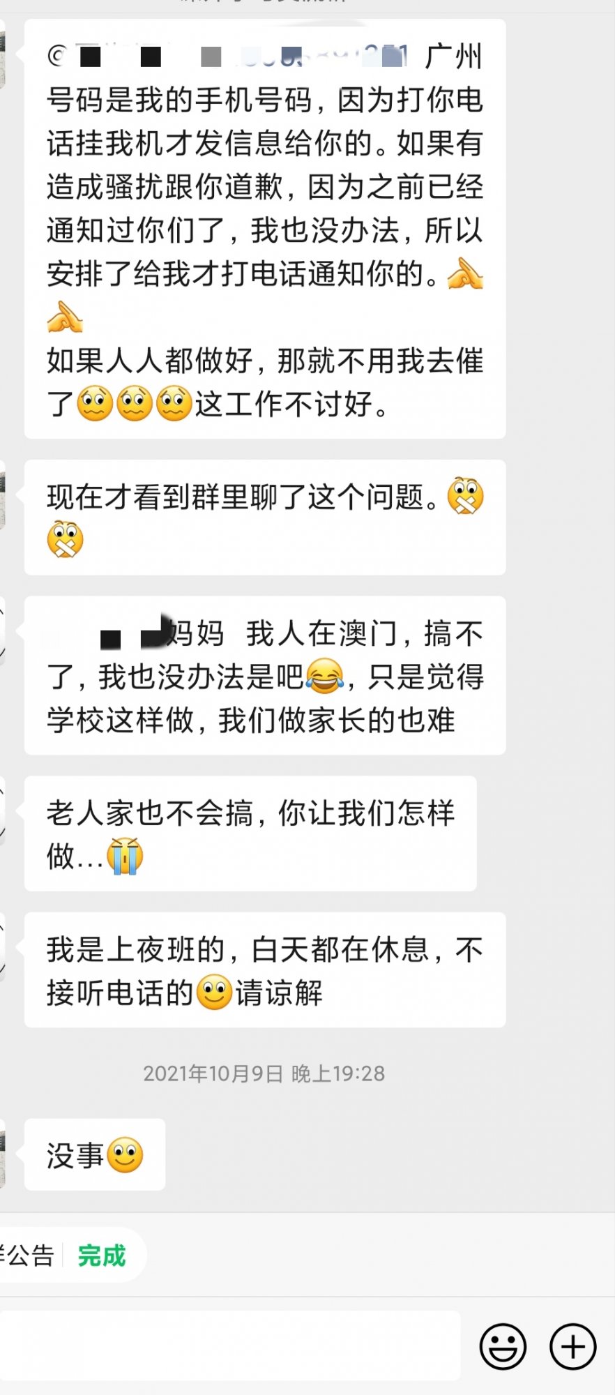 现在几乎什么时候有空什么时候完成,群里的大堆垃圾信息再与学习无关,早已不关心群里发生了什么,通知了什么,只有被老师圈的时候才知道任务漏了没完成。这样的手机任务全由家长独立完成,我早已没让小孩一起看了,根本就没那个闲工夫一起研究,回来就是做不完的作业,有时辅导都忙不过来,班级微信群就不应该存在,这种东西已经变性成了家长们累赘,变成了政治性的任务,变得了毫无意义。
