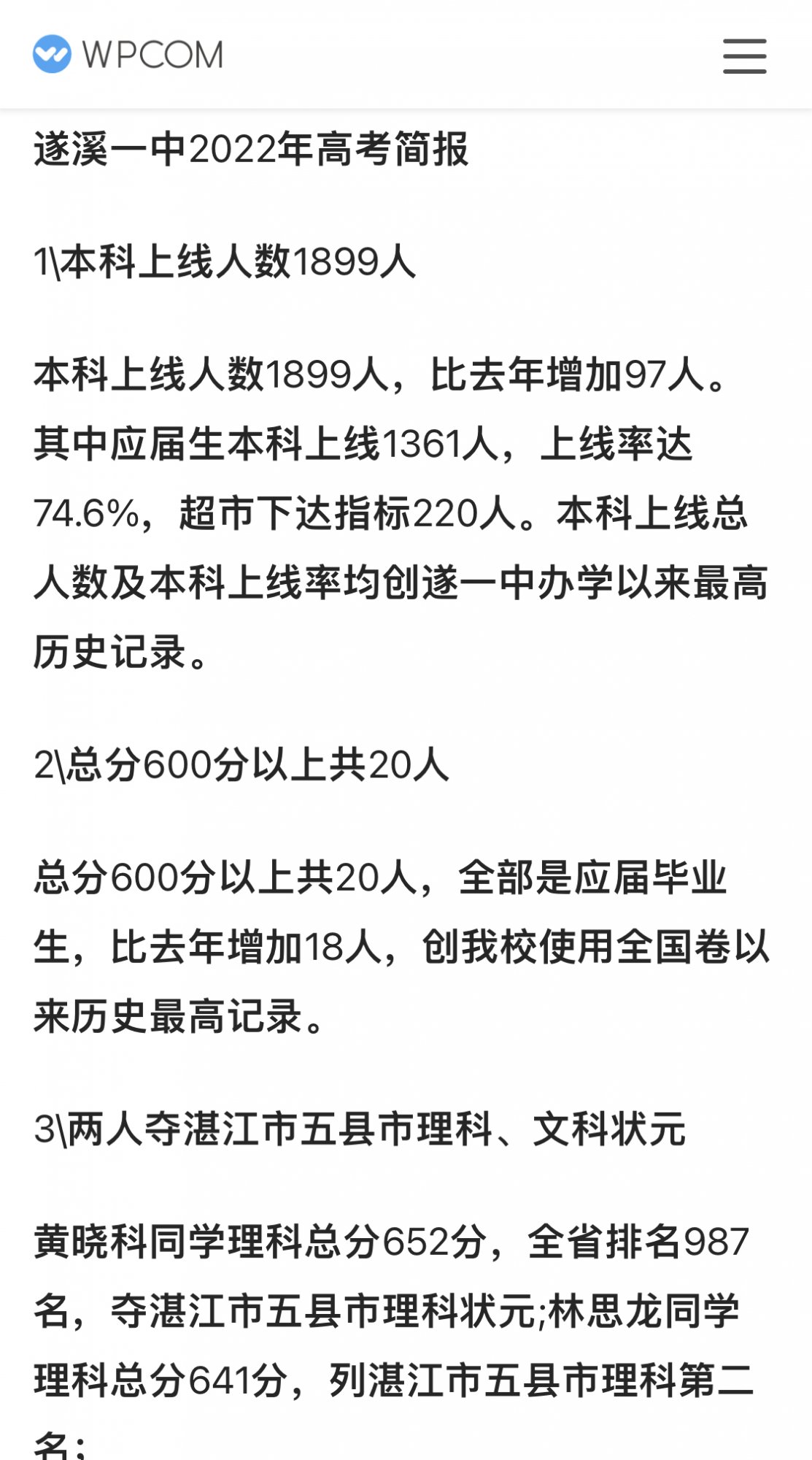 cam621 荣誉主席 注册 2005-12-30 消息 4,869 反馈评分 286 点数 191 2022-06-24 #122 四哥 说: 比不过遂溪一中。浏览附件359651 点击展开... 春华4个班,150多人,600分以上8人,但最高分比不过,个人觉得还算可以了。