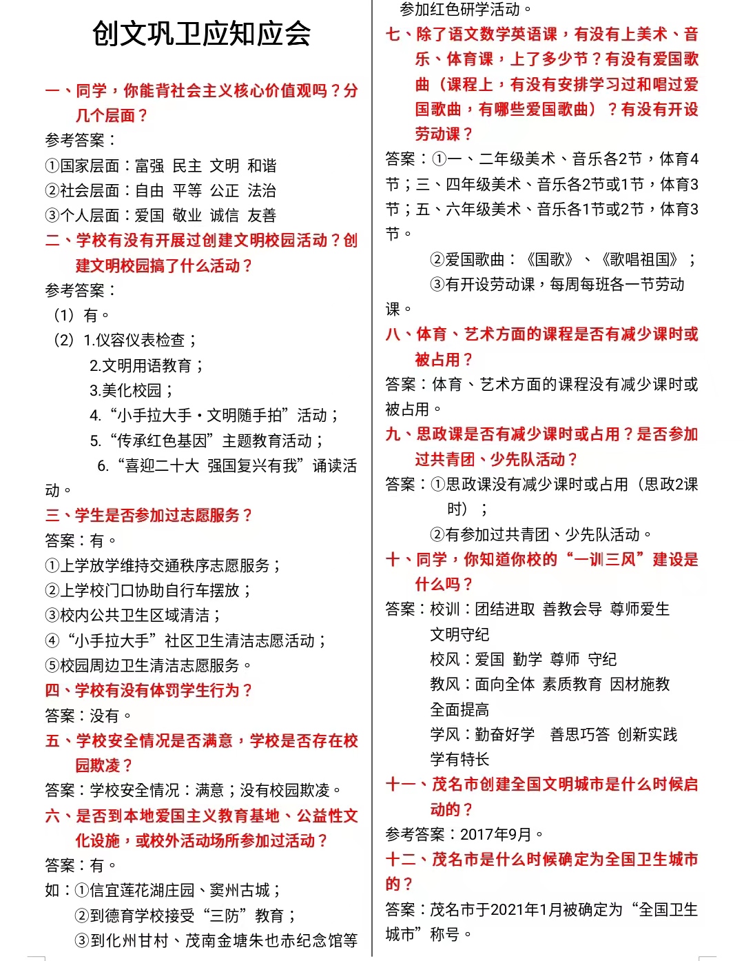 【某某政教处】通知:因10月17、18、19日是电白区创文督查时间,请把以上两项“创文巩卫”调查问卷转发到班群,并叮嘱家长让学生这两天熟记里面的内容,确保这两内容在抽查中不丢分,。请各班主任抓好落实,每节课前都抽查学生,确保人人过关。 @所有人 请各位家长利用周末协助督促孩子熟记以上两项“创文巩卫”调查问卷的内容,谢谢配合!