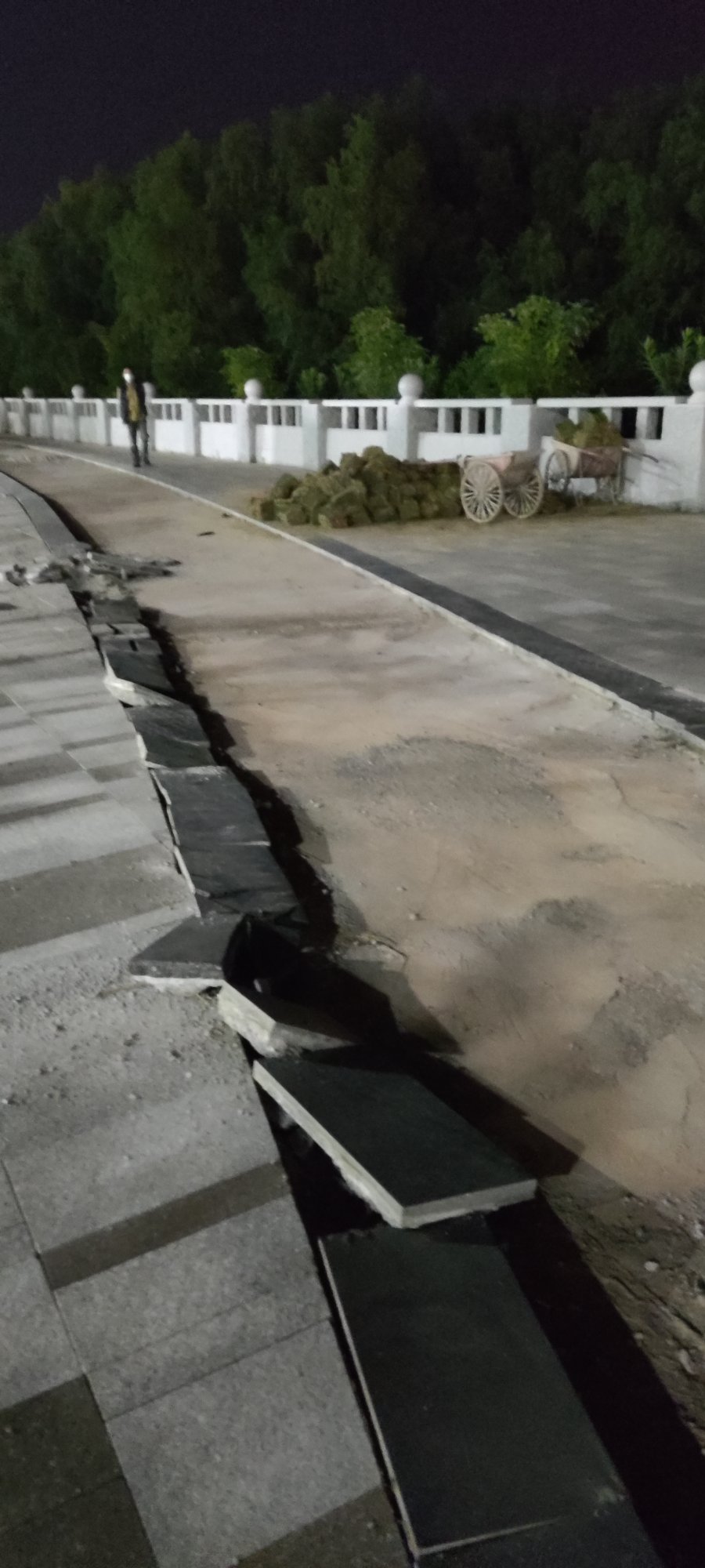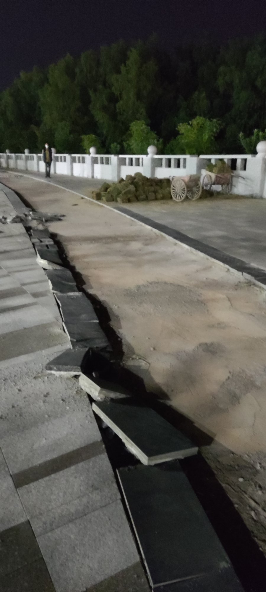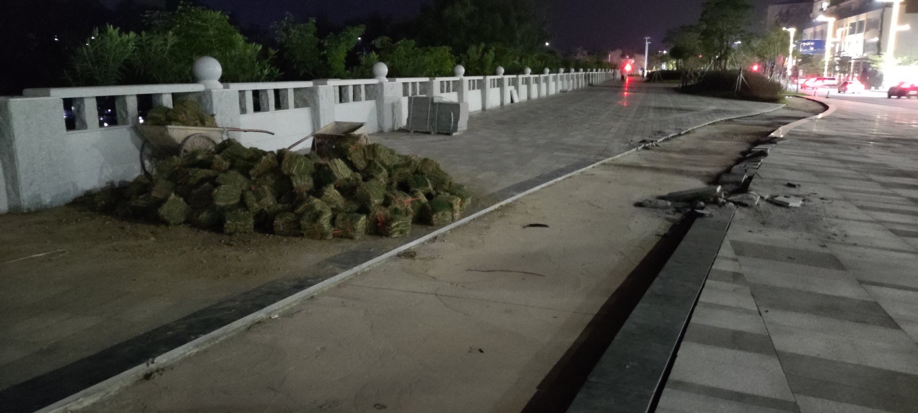 海堤路财富盛世旁的湿地公园,石板砖铺上没几天,就被野蛮施工的载重汽车碾碎了!