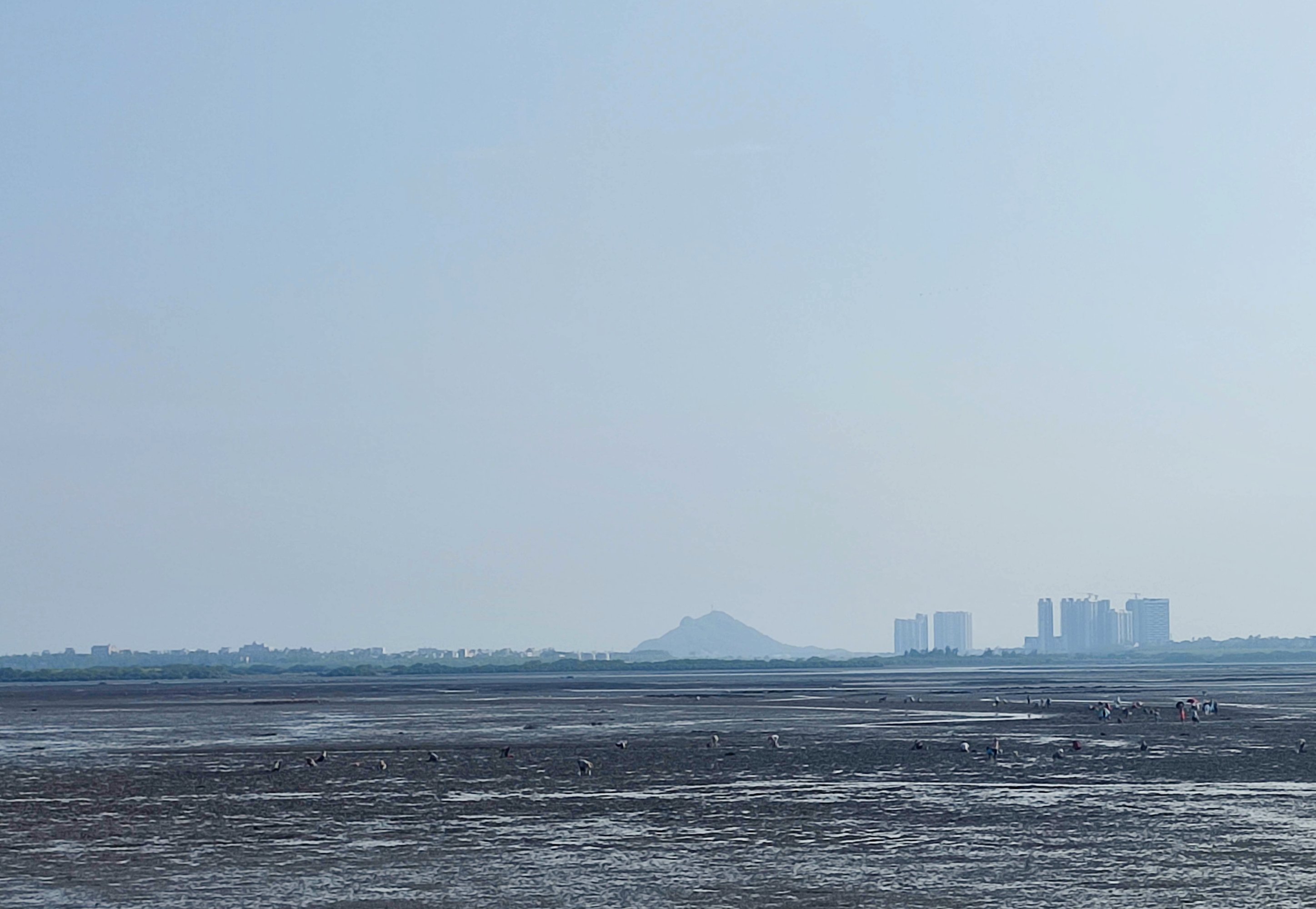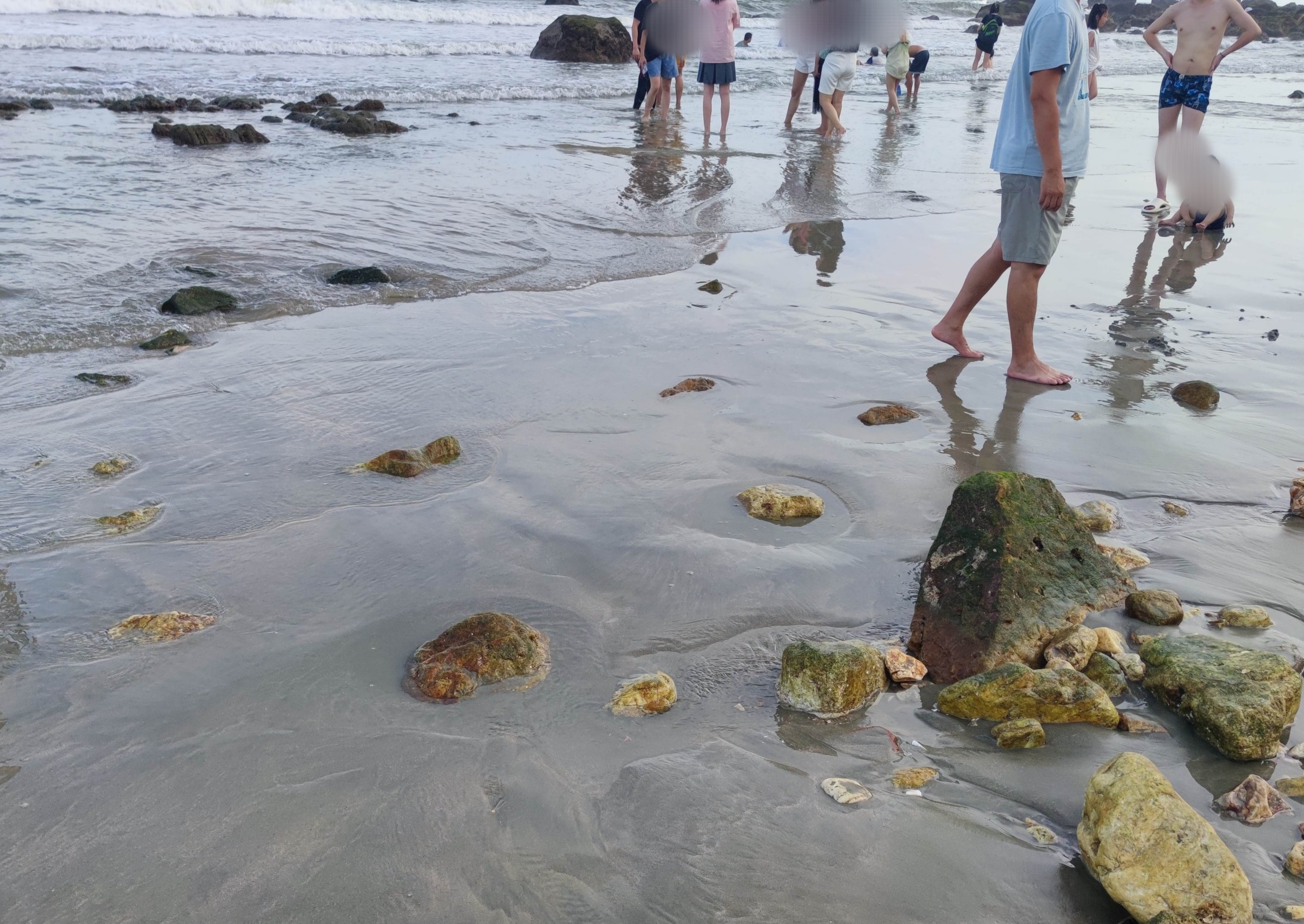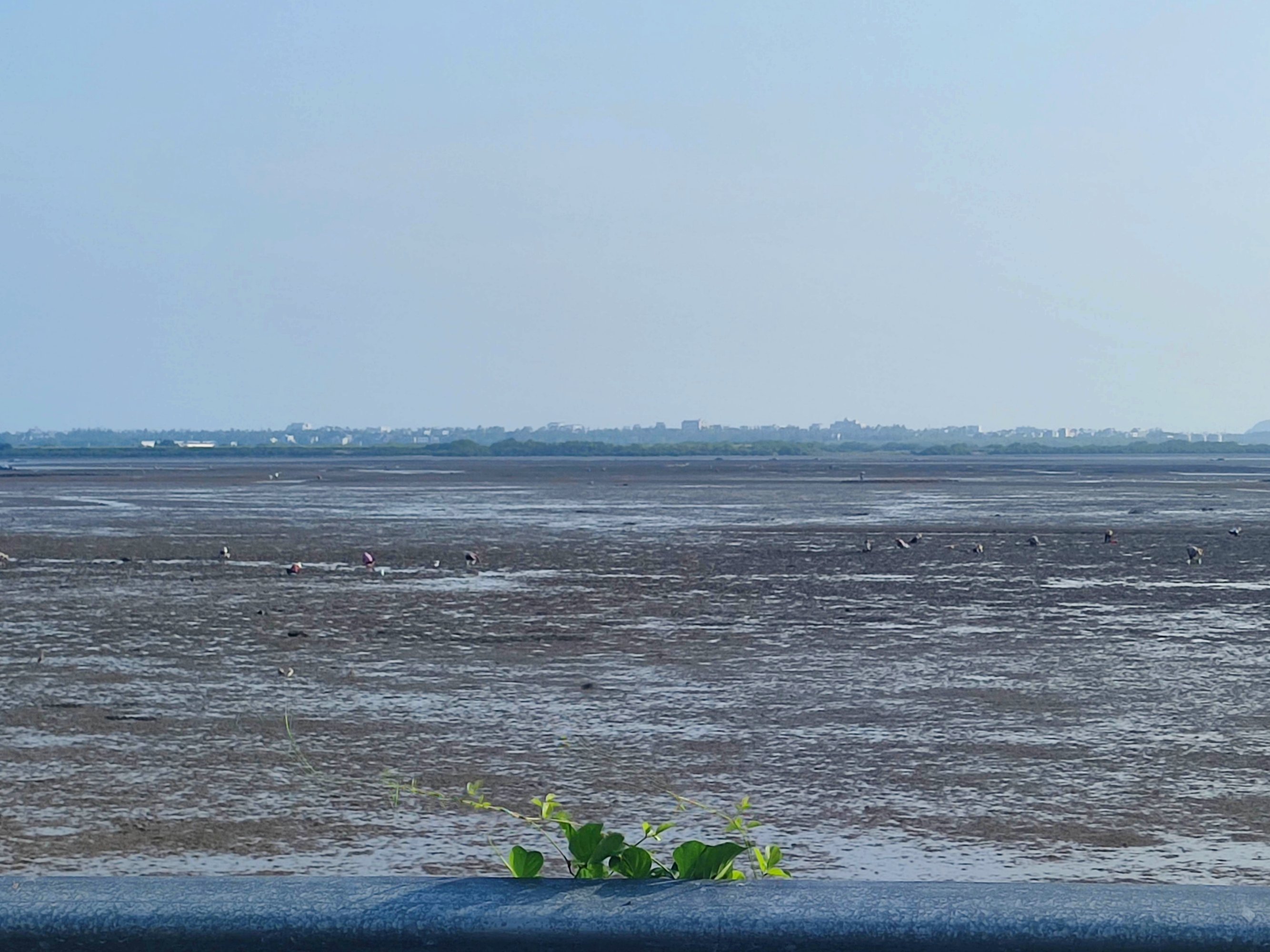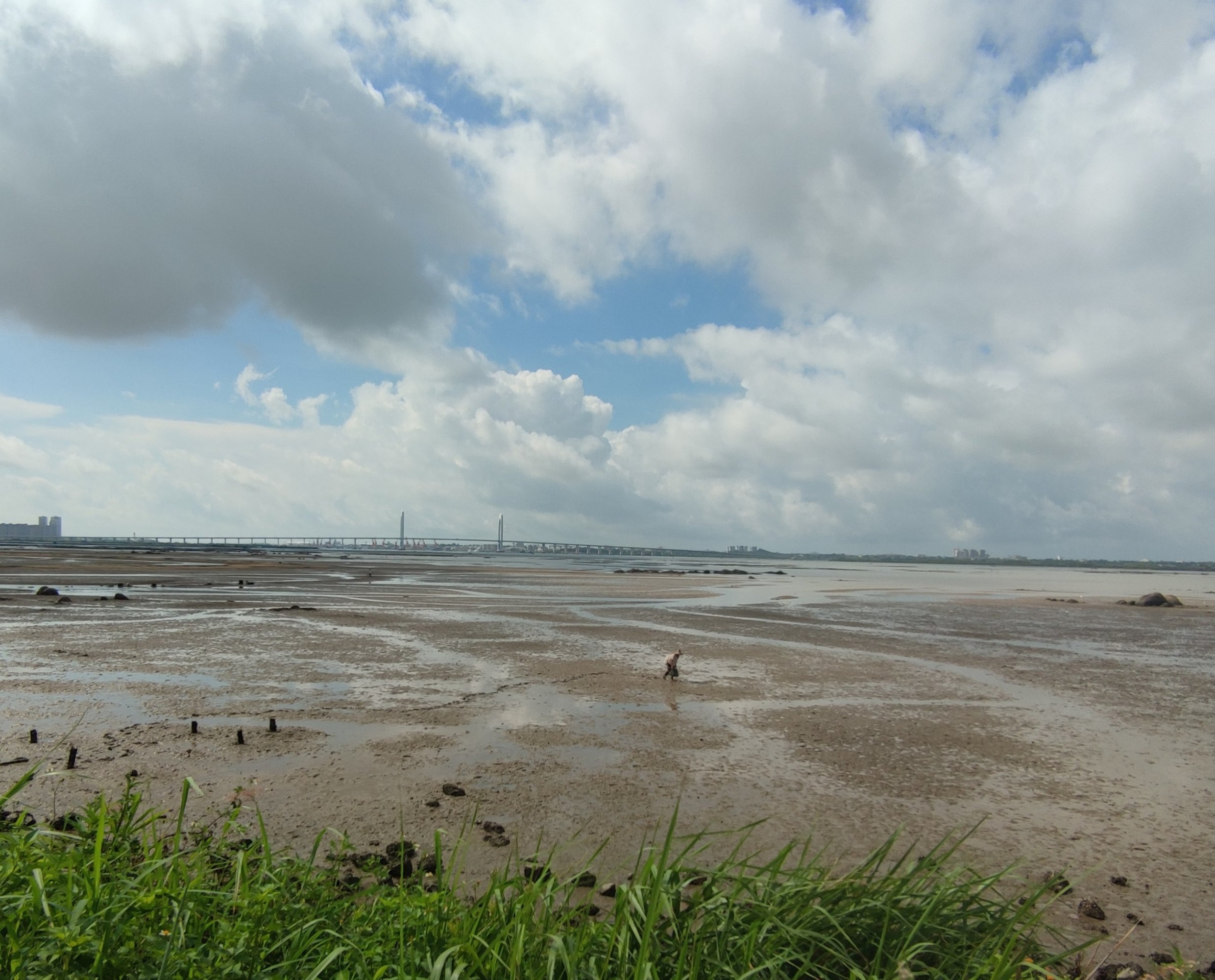 再续渐的退潮,不过远处的一些较深一点的海水河道凹的地方还有海水停留,海水好像并没有完全的退去…?不过潮涨潮退也许或许也好像有自洁流动作用??,还有一些滩涂退潮后,有好多海生物如贝壳小鱼虾等等露出爬出滩面,还有好多知道的人过来下去拾贝壳小鱼虾等等,不过要小心点,最好穿着水鞋等保护脚板脚部东西,避免给滩上东西刮到伤到,大人要看管好小孩,不要离开视线等等…