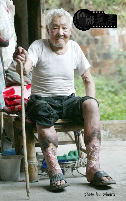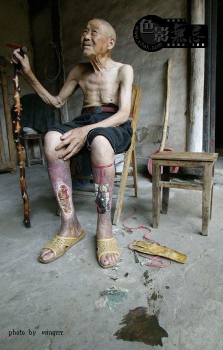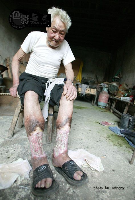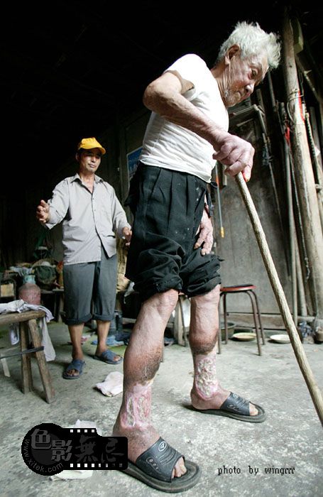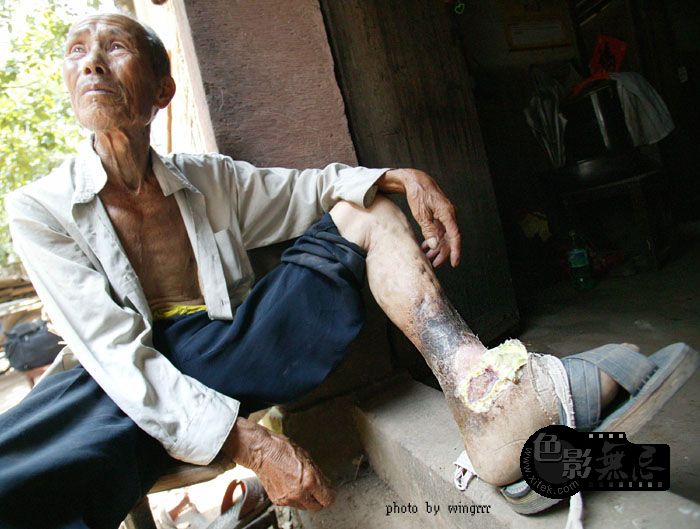 23岁时(1942年8月),日本鬼子走了。不久,一家7口人有6人在一个月内先后烂腿――刚开始腿上起疱,不痛有点痒,并开始发烧,肿胀、发黑,没几天就烂开了,伤口及四周结起黑痂。老人的爷爷、奶奶、爸爸、妈妈、姑姑先后都烂死了,7口人只有2人活了下来,村子里当时大约有80来个烂腿的,现在活着的只有他一个人了。60多年来,家里医药费花了数万元,但这双烂腿从来没有好过。