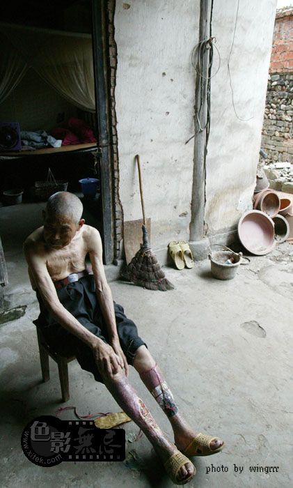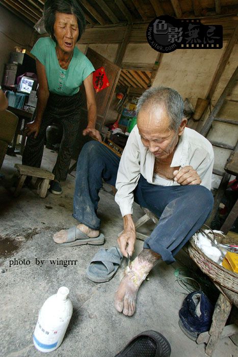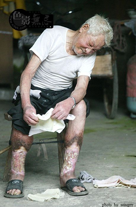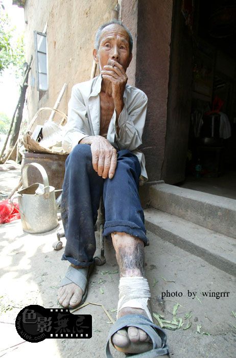 我们在旁边说话,老人一点都听不见,他自顾自的将腿上一块干掉的皮撕掉。