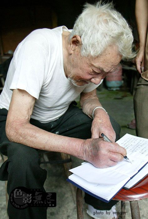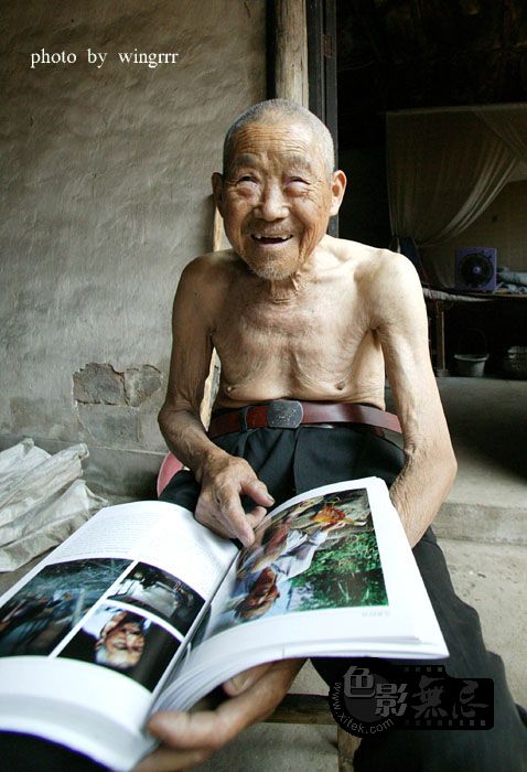 老人神志已经不太清了,耳朵也不好,跟他说话基本听不见。但是他看到自己的照片后,抬起头来对我微笑!那神情就如一天真的小孩子,非常的可爱!