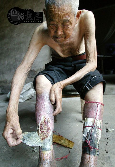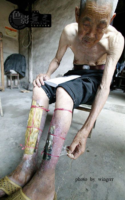 当老人的儿子卷起老人裤管的时候,我惊讶地发现他的伤口居然是用旧报纸和粽叶包着!
