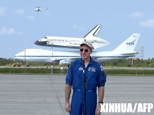 8月21日,一架经改装的波音747飞机搭载着美国“发现”号航天飞机返回了佛罗里达的肯尼迪航天中心,“发现”号宇航员鲁宾逊对媒体发表讲话。 新华社/法新