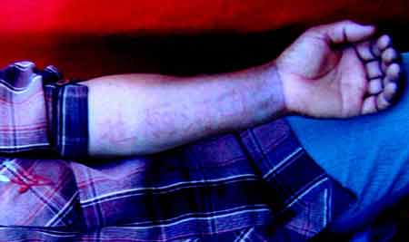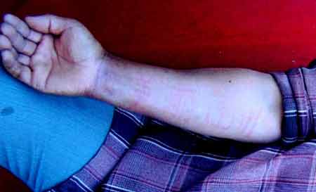 榆中“奇女子”皮肤“长”字的奇事经本报报道后,许多读者对此事的真实性提出质疑。一位读者说,这个“奇女子”可能患有皮肤划痕症,用力划自己的皮肤就能出现印痕。他自己也患有皮肤划痕症,如果用手掌拍就可以出现5个红指印。为了证实这种划痕现象,这位热心读者当着记者的面,在他的胳膊上用指甲划了一个“甲”字,果然清晰可辨。