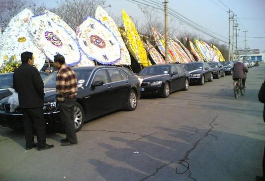 在唐山有一场空前盛大的葬礼,葬礼场面真得让所有人都目瞪口呆。大家都是车迷说说车队吧!头三辆指挥车是3辆军车,第一辆是军B的本田 然后是两辆武警的三菱越野。然后是两辆霸道的摄像车,后面是两辆黑色的旱马H2, 紧跟着这两辆旱马的后面分别是一排奔驰S55和S600,具体多少辆没有数,绝对在15辆以上,然后和奔驰并排就是一排宝马7系和奥迪A8 我只看到前三辆7系都是新款760, 这一排车和旁边奔驰车队一样长本来以为就这么多后来再往前走一转弯就看到一条马路两边停满了宝马X5越野和保时捷凯宴等顶级越野车估计光越野车队就有200米长30多辆车吧!