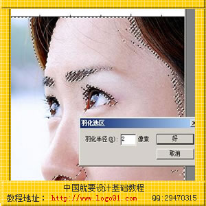 第一步:打开MM的黑眼圈照片,按“Ctrl++”键将图像放大到300倍,在“工具”栏里用鼠标左键单击并按住“套索工具”不放,在弹出的工具选项中选择“多边形套索工具”。接着沿眼线将左眼黑眼圈部分选取,然后执行“选择→羽化”命令,在弹出的“羽化选区”对话框中将“羽化半径”设置为5像素,最后单击“好”按钮(图1)。