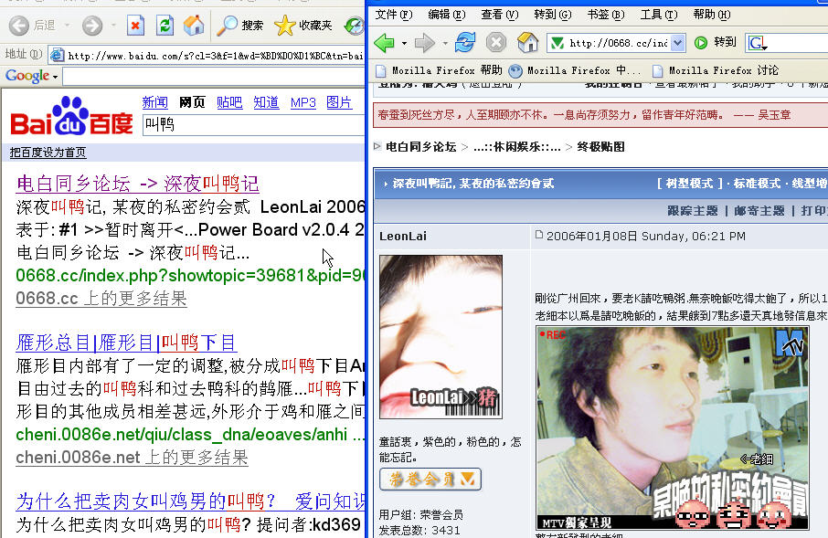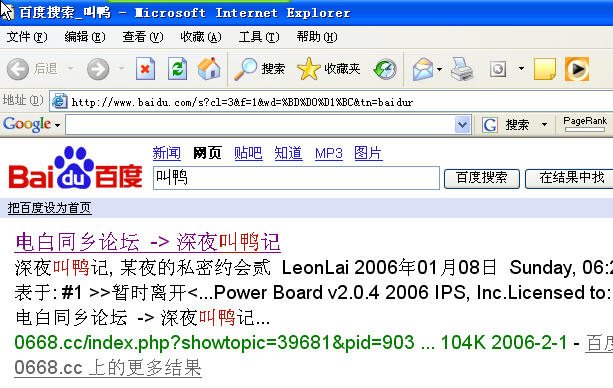 潘火鸡 小学三年级 注册 2005-07-08 消息 247 反馈评分 13 点数 1 2006-03-14 #1 在百度搜索“叫鸭”,第一页第一条结果竟然是。。。。 [attachmentid=71303] [attachmentid=71305] 附件 111111.jpg 78.9 KB · 查看: 304 222222.jpg 182.6 KB · 查看: 317