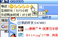 QUOTE(安臣 @ Feb 16 2005, 08:37 AM) 我仲K,都不知道自己几!!:( [snapback]242648[/snapback] 照你所发上来的图片来看,你是13级! 如果你不知的话,那么快点把你的QQ升下级! 最好用2004版的QQ,就可以查看等级了!
