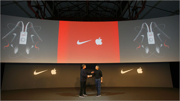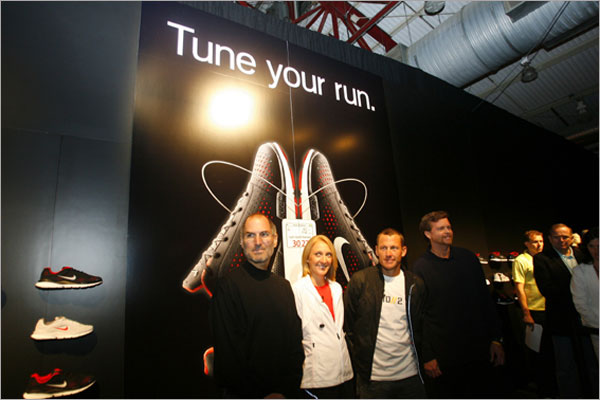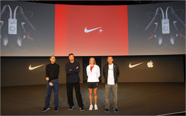 耐克公司首席执行官Mark Parker与苹果公司首席执行官Steve Jobs在美国纽约举行的全球新闻发布会上首次向公众展示了Nike+iPod运动组件。环法自行车赛七次冠军得主阿姆斯特朗(Lance Armstrong)和女子马拉松世界记录保持者拉德克利夫(Paula Radcliffe)参加了这次新闻发布会。