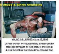 据我了解,华裔自1995年起,一直是印尼的主要投资者。但在印尼他们连三等公民都不是,我听说在棉兰有很多华人子女被绑架,女性被强暴。有一间华人经营的时装店被抢劫后,店主11岁的女儿更被强奸,然后施暴者还以木棍插入女童下体,女童最终不治身亡。后来我开车去过华人的聚居区和商业中心,无一例外,整条街整条街的被洗劫一空,到处是断壁残垣。就是中国人记忆中的"三光政策"--"烧光、杀光、抢光"。我在参观的过程中真正体会到自己做为日本人是多么的幸运,因为这是活生生的暴力事件,而不是电影 剧本,哪些以前在影视镜头中看到的砍刀砍头的镜头就活生生的发生在我住的城市,非常 震撼人的心灵,至今我都不能忘记。