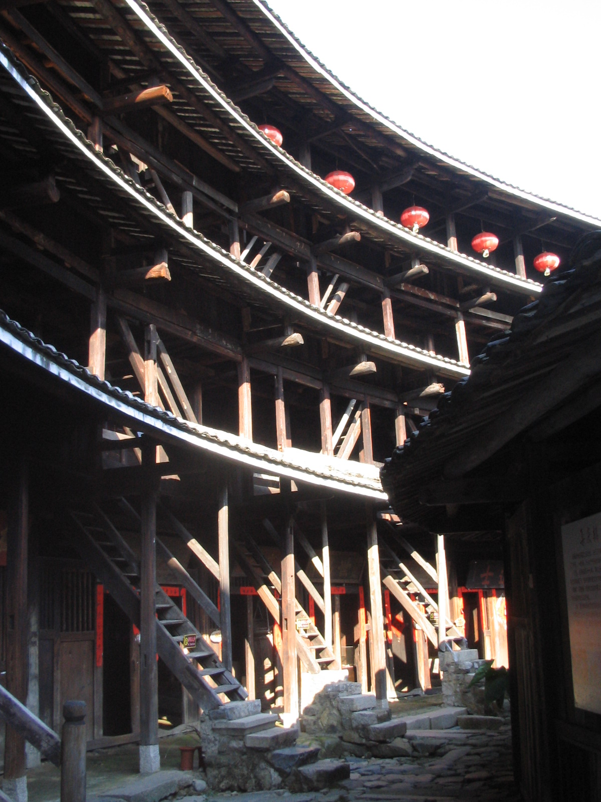 站在宽敞的天井里,抬起头看着圆圆的一圈天空,层层屋台,巨檐大梁,不由让人感到巨大空间对人的压迫。但是,丰作厥宁楼与永定、南靖的圆楼完全不同的是,在聚族而居的集体住宅里,每家每户又是各自独立的,各建一座小门楼,有一个小天井,有楼梯从一楼直通四楼。所以,当你把自家的小楼门关上,你就有了一个相对独立与私密的家了。这种聚族而居又彼此独立的模式,在动荡年代里,既避免了一般土楼过度公共性的缺点,又消除了单门独户的恐惧心理,实在是公私兼顾、两全其美的创造性设计。