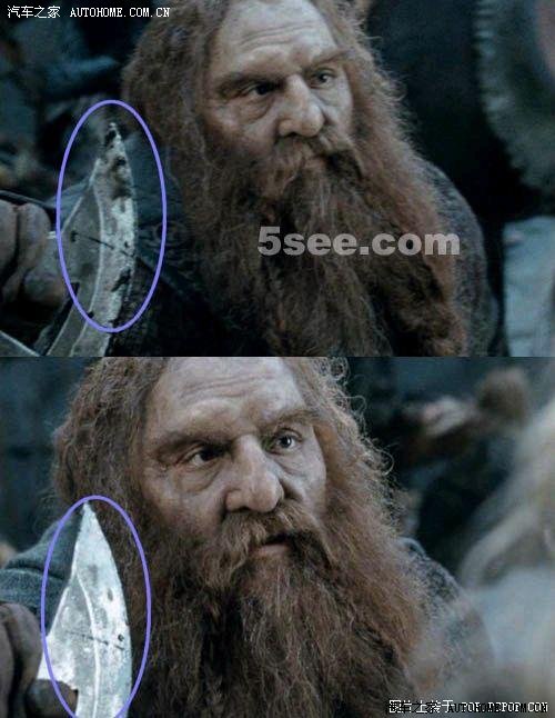 斗间隙吉姆利与阿拉冈谈话的场景中,他的斧头由于刚杀了人沾了血迹,但在下个镜头中血迹不见了。