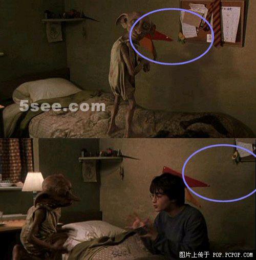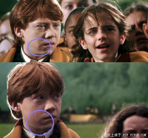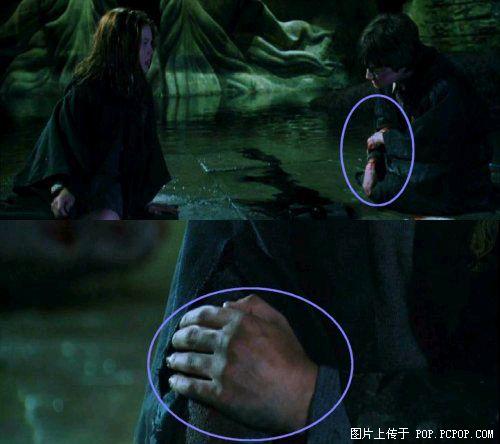 68、哈里波特左手按在伤口上和ginny说话,当时手背有着血污,随着镜头拉近,血污消失了。