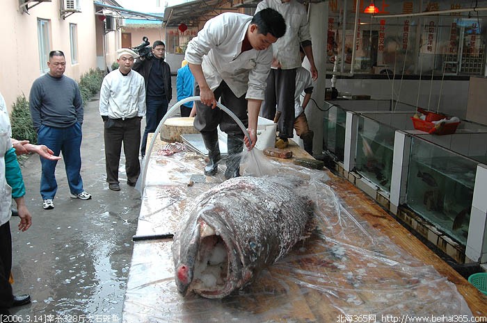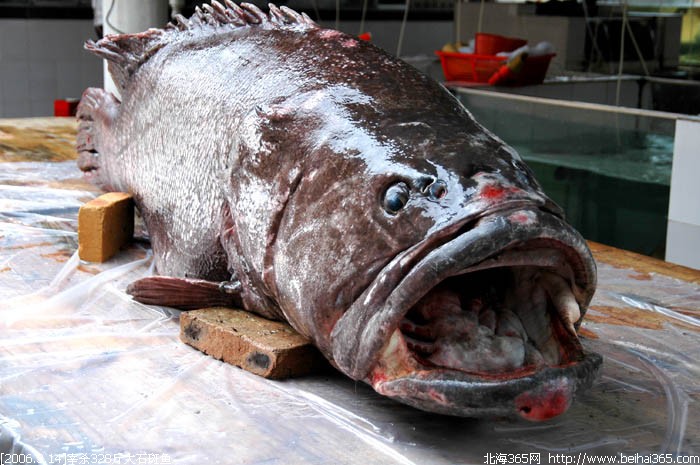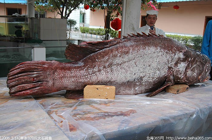 这条石斑鱼有328斤重!身长210cm!平时我们见到的石斑鱼最大的也就五六斤重,那么这条三百多斤重的石斑可以说是成精了!据老板说,这条鱼是在跨海大桥桥底的岸捕获的,当时是下午两点多钟的时候,一个合浦县闸口镇女渔民,在岸边发现了这条搁浅的庞然大物,于是,她马上叫人来拖回去,肥佬食街的老板得知后,以近三十元一斤的价格从该渔民手中购得。据老板介绍,明天下午四点钟将会在食街将这条鱼进行现场拍卖,笔者算了一下,就算是按三十元一斤来算的话,这条鱼也得上万块钱!!