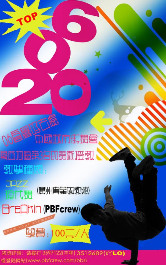 大家好! 关于街舞。 可能有很多人对街舞没什么好感.以为不是很好, 这可能是对街舞的认识程度不足.! 如果大家想深深的认识借街舞的话.就趁这个机会赶快来报名吧. 在暑假的2个月里.好好的学习遍.! 教学种类: 女子由:《广州专业女教练》. JAZZ. 现代齐舞.等等..... 男子: POPING. BAEAKIN. 教学时间: 男子: 15 节课 女子: 12 节课 收费种类: 男子:《 100元 》 女子:《 120元 》 PBF.CREW