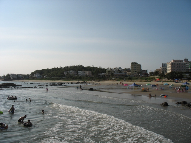 沙扒,沙滩小又有岩石刮脚,但有酒店大排挡等,饮食方便。