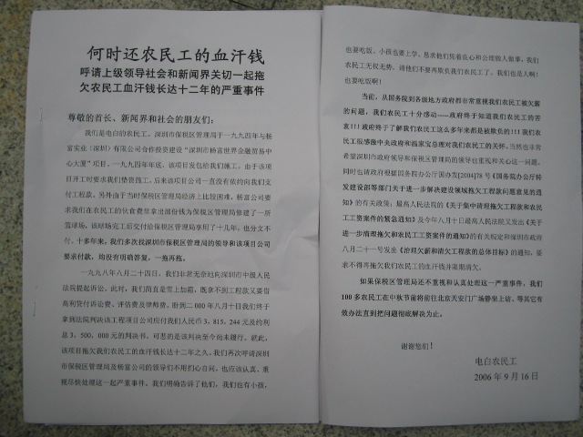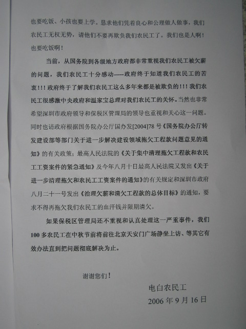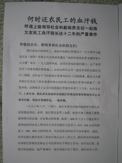 四中乐叔 版主 版主 注册 2006-05-06 消息 6,725 反馈评分 3 点数 61 2006-09-19 #1 声援和关注在深圳福田保税区拖欠工资的电白农民工兄弟。 十三年前,来自电白的农民工,承接了深圳福田保税区管理局和台湾老板合资兴建的一栋大厦的基础桩地下工程。基础桩地下工程完工,至今未收到工程款。法院已判决赔偿。但至今无法执行,悲惨的农民工兄弟惟有在今天早上来到深圳福田保税区管理局讨要工钱。乐叔特赶去拍照。 附件 IMG_8747.JPG 130.1 KB · 查看: 451 IMG_8745.JPG 134.6 KB · 查看: 499 IMG_8743.JPG 1.1 MB · 查看: 467 IMG_8750.JPG 124.7 KB · 查看: 518