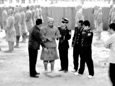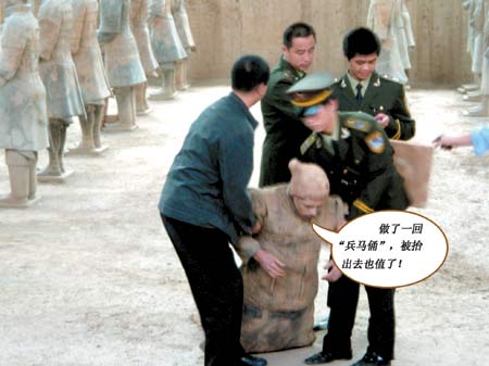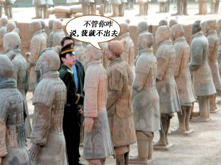 他摆出身旁秦俑的造型,任工作人员和翻译怎么劝说,他既不躲闪,也不吭声