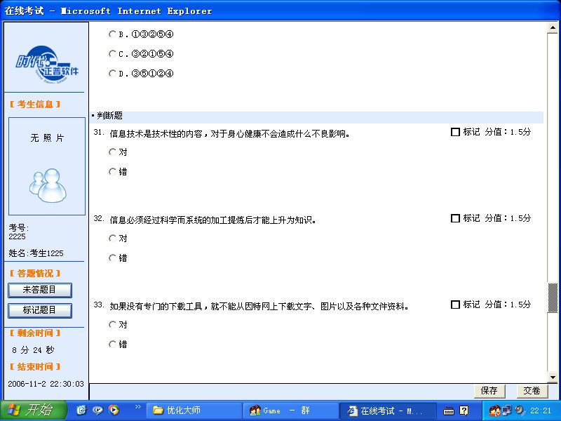 进去系统后显示.因为这次是模拟考试只提供30分钟做答时间(正式的有70分钟).