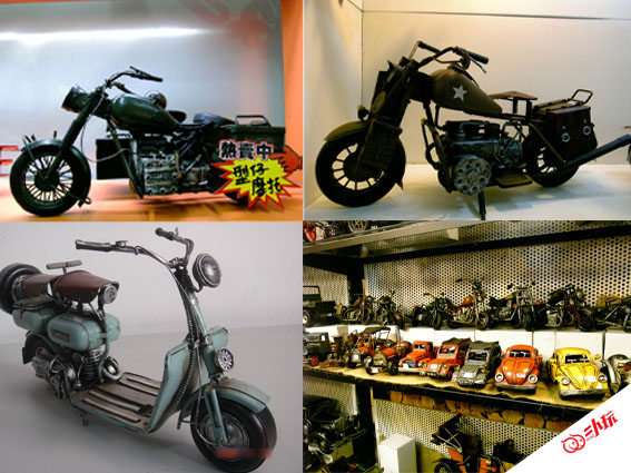 摩托车是模型来的,纯金属制作,几十文一部.大的三轮摩托就不止这个价钱了..