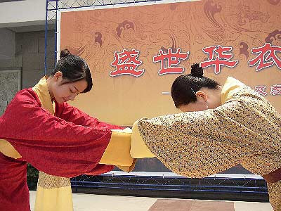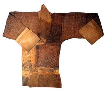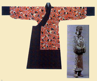 汉代妇女服饰实物 湖南长沙马王堆一号汉墓出土的实物中,服装的款式是典型的西域民族样式,但质料和纹样有汉族特点,还织着富有吉祥如意的汉字,是东汉时期各民族人民相互交融的产物。马王堆汉墓发掘出的实物资料异常丰富,尤其是服装,经历二千多年,质地仍然坚固,色泽依然鲜艳,反映出古代劳动人民的精湛技术和高超水平。本图为“信期绣”茶黄罗绮绵袍(湖南长沙马王堆一号汉墓出土实物),身长132公分,两袖通长228公分。