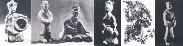 汉代平民百姓服饰 左1图为穿襦裙的侍者(内蒙古包头孟家梁汉墓出土的陶俑)。左2图为束巾、穿袍服的侍者(河北邯郸彭家寨出土的彩绘陶俑)。左3图为戴帽、穿袍服的男子。左4图为头上簪花、穿襦裙的侍女(四川重庆出土汉代陶俑)。左5图为束巾、赤膊、赤足、穿的杂技艺人(山东沂南汉墓出土画像石拓片)。右图为穿袍服的侍者(陕西西安出土陶俑)。汉代规定,百姓一律不得穿各种带颜色的服装,只能穿本色麻布。直到西汉末年(公元前13年)才允许平民服青绿之衣。对商人的禁令更严。然而在服装的样式上,似乎没有严格的制度。从出土的汉代陶俑及画像砖石来看,劳动者或束发髻、或戴小帽、巾子,也有戴斗笠的,身上穿的服装,几乎全是交领,下长至膝,衣袖窄小,腰间系巾带,脚穿靴鞋,还有不少赤足者,反映了这个时期劳动人民的生活状况。