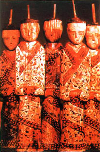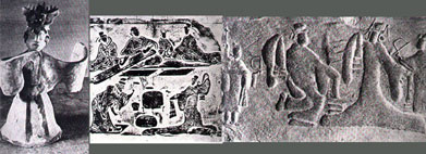 汉代舞女服饰 左图为头梳盛髻、身穿长袖袍服的舞女(广州汉墓出土陶俑)。中图为穿袍服的歌女与舞女(四川成都汉墓出土画像砖拓片)。右图为梳分髻、穿长袖袍服的舞女(四川彭县出土东汉画像砖)。 秦汉时期,我国的舞乐表演艺术在前代基础上有较大进步,并出现了专职的歌舞艺人,以共封建贵族阶层的观赏。在汉代的壁画、石刻、砖刻等艺术图像中常可看到这样的情况。本图所列的陶塑舞女,服饰交代得比较清楚,头梳高大的发髻,髻上插满珠翠花饰,为典型的东汉装束。身穿曳地长袍,衣襟左掩,即史书所称的“左衽”。最有特点的是袖端接出一段,各装一只窄而细长的假袖,以增加舞姿的美观。后世戏曲服装上的“水袖”,可能是由此而来。