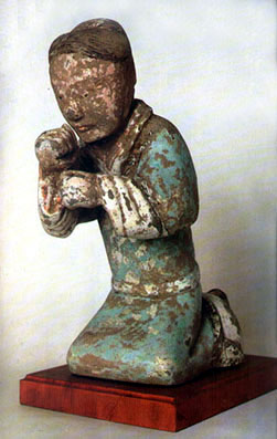 汉代男子的曲裾深衣 左图为戴帽、穿曲裾服的男子(陕西咸阳出彩绘陶俑)。右图为穿曲裾身衣的男子(陕西出土西汉陶俑)。汉代的男子的服装样式,大致分为曲裾、直裾两种。曲裾,即为战国时期流行的深衣。汉代仍然沿用,但多见于西汉早期。到东汉,男子穿深衣者已经少见,一般多为直裾之衣,但并不能作为正式礼服。本图正是这种曲裾服饰。