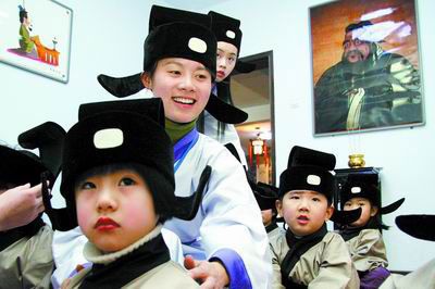 冕旒依数量及质料的不同,是区分贵贱尊卑的重要标志。汉代规定,皇帝冕冠为十二旒(即十二排),为玉制。冕冠的颜色,以黑为主。冕冠两侧,各有一孔,用以穿插玉笄,以与发髻拴结。并在笄的两侧系上丝带,在颌下系结。在丝带上的两耳处,还各垂一颗珠玉,名叫“允耳”。不塞入耳内,只是系挂在耳旁,以提醒戴冠者切忌听信谗言。后世的“允耳不闻”一语,即由此而来。按规定,凡戴冕冠者,都要穿冕服。冕服以玄上衣、朱色下裳,上下绘有章纹。此外还有蔽膝、佩绶、赤舄等。组成一套完整的服饰。这种服制始于周代,历经汉、唐、宋、元诸代,一直延续到清代,绵延两千多年。