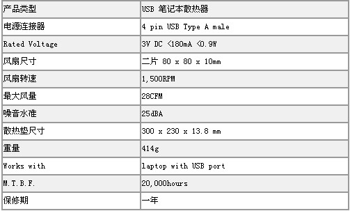 该产品内置二个超簿型电动风扇,不需外接电源,直接通过笔记本之USB接口取电,吸走笔记本底部的热空气并从背面出风口排出,使笔记本始终处于低温下工作,增加系统的稳定性,并延长笔记本电脑使用寿命。产品设计轻巧雅致不占空间,即可以放在膝上,也可以放在桌子上使用,真正方便实用。