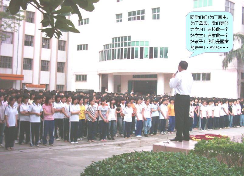 学校的指导思想是:凡四中人,包括教师员工和学生都有责任参与学校管理。校长负责全校管理,副校长负责专线管理,各科负责本科教研开发,级负责本级的全面管理,各班主任负责本班管理,科任负责课堂管理,学生负责自我管理等。全员管理的意义在于调动全体四中人的工作积极性,主动性,促学校管理步入良性循环,高效运转,全面提高教研教学质量。“值日岗”的工作人员表现不错,是全员管理工作的先导。