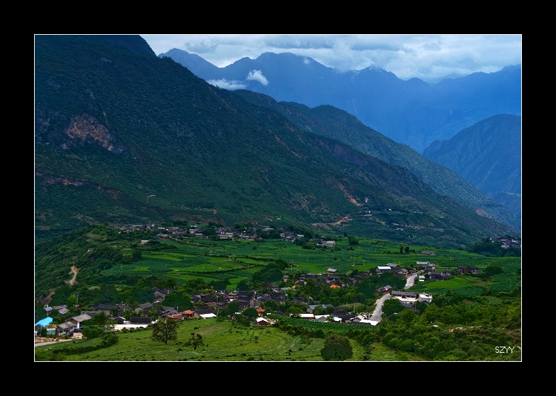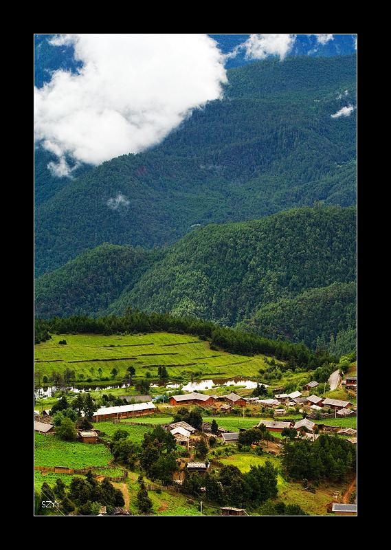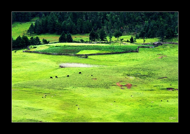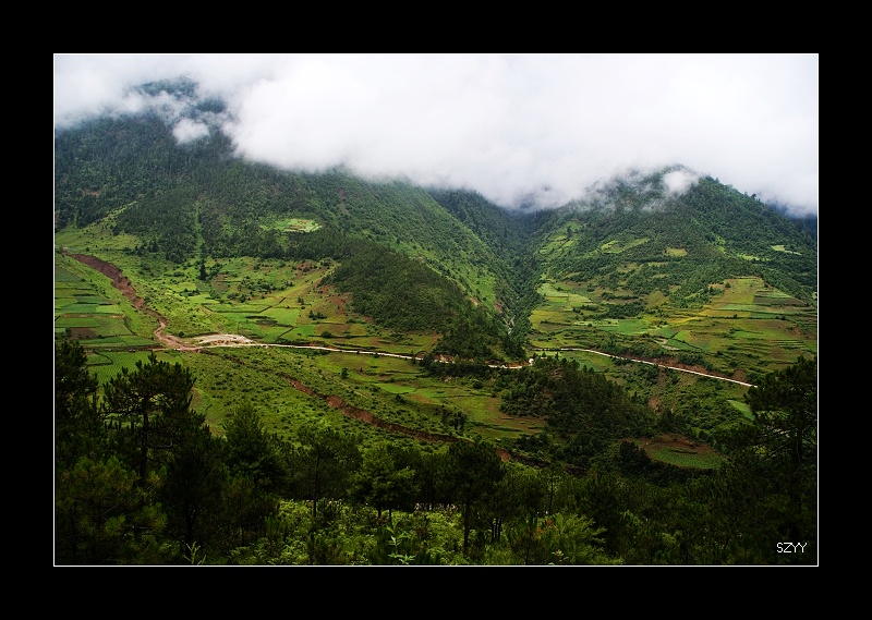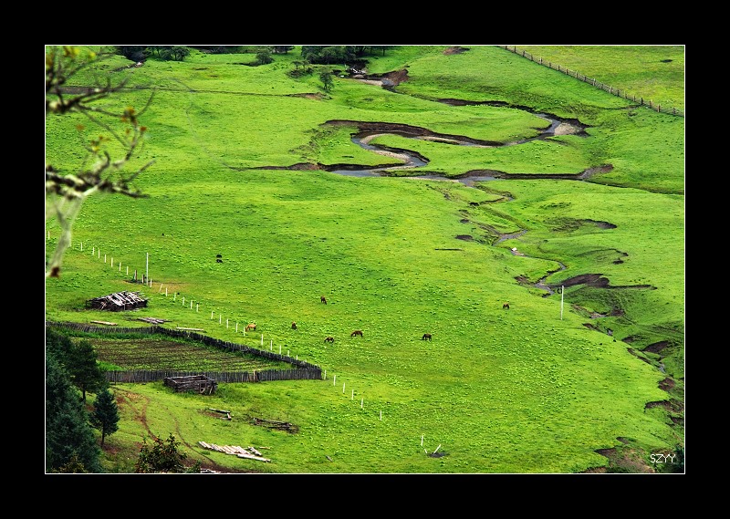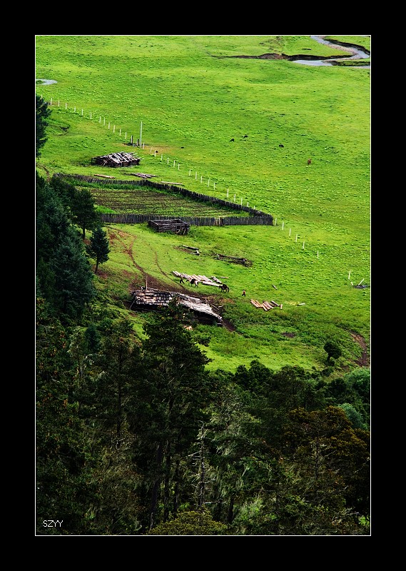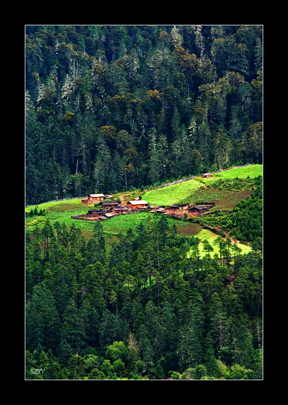 这个地方是我们先看到几个骑单车走滇藏线的西班牙人,在向下张望,我们马上停车,用长焦镜头搜索才发现的,远离尘世,晃若仙境,我们在山上的路边,隔着悬崖和原始森林,下不去,只能通过望远镜或者用长焦镜头来看,肉眼几乎看不到那些小牛小马小羊和小人.牛马的铃铛声若隐若现,如同仙乐,十分动听.