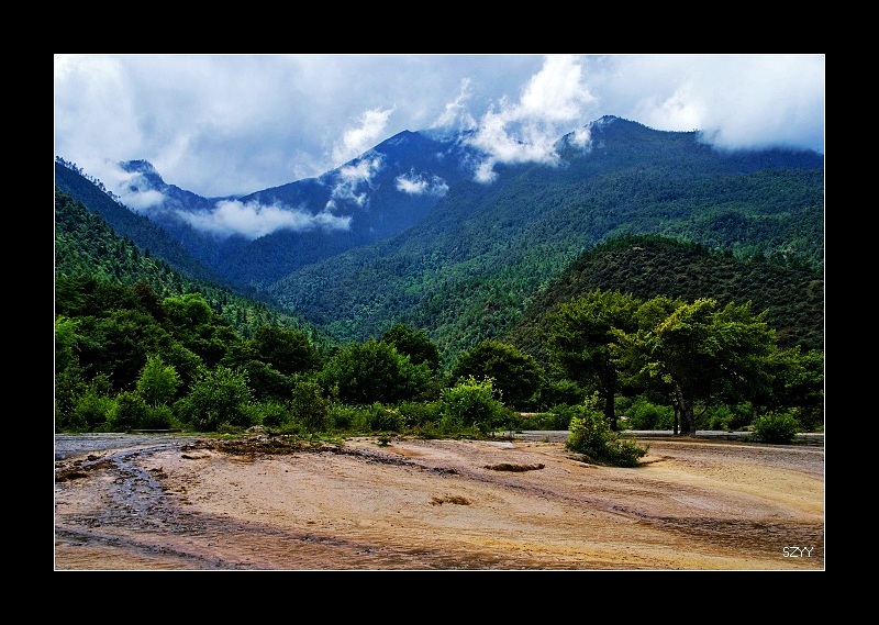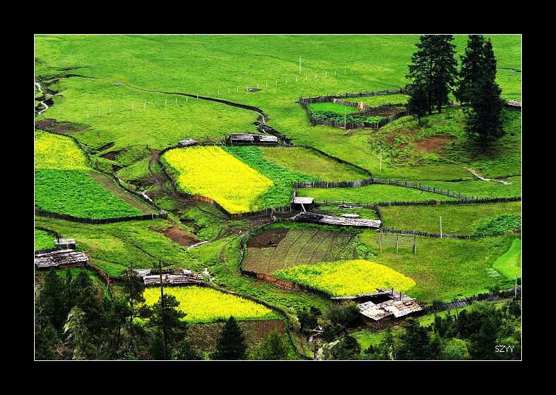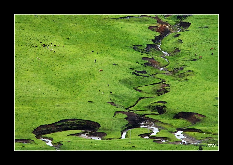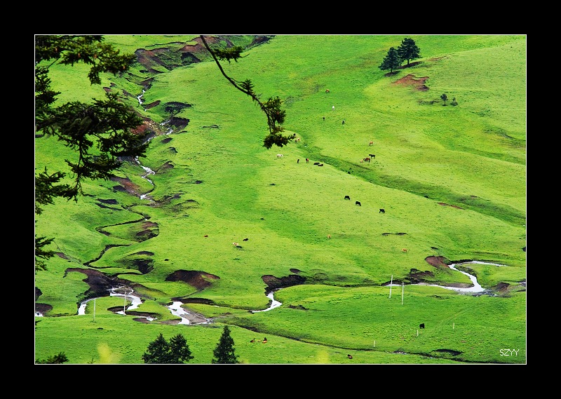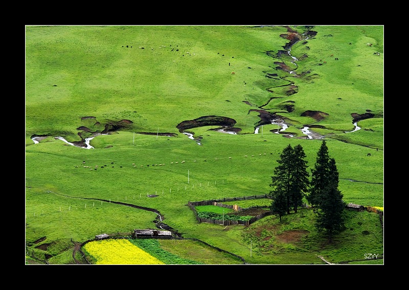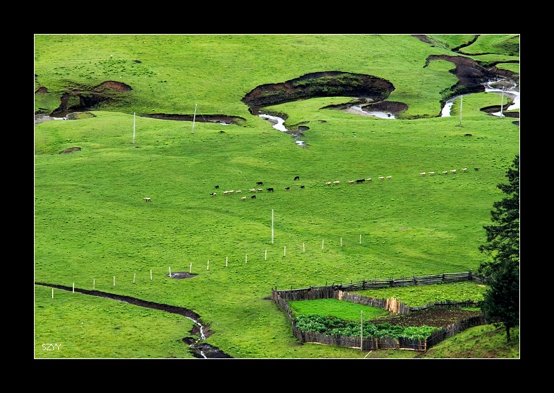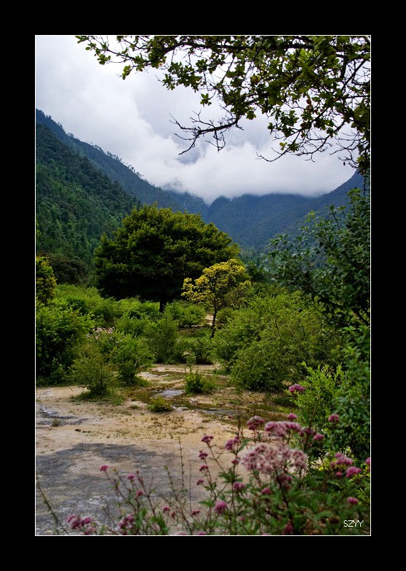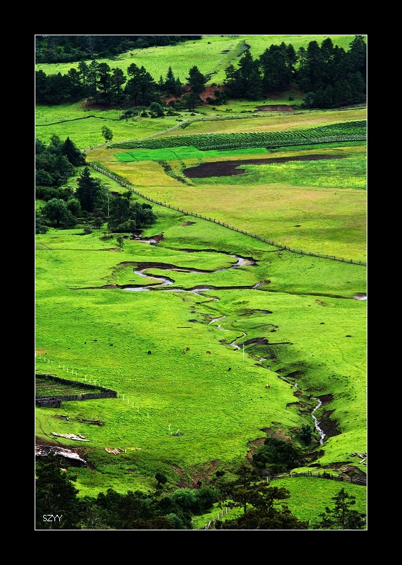 这个地方是我们先看到几个骑单车走滇藏线的西班牙人,在向下张望,我们马上停车,用长焦镜头搜索才发现的,远离尘世,晃若仙境,我们在山上的路边,隔着悬崖和原始森林,下不去,只能通过望远镜或者用长焦镜头来看,肉眼几乎看不到那些小牛小马小羊和小人.牛马的铃铛声若隐若现,如同仙乐,十分动听.