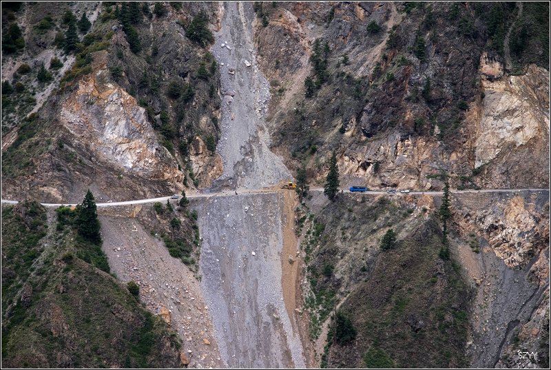 随着海拔高度的升高,备用油桶密封不严,车里又充满了汽油味,这几天,我们已经学会了根据汽油味的大小判断海拔高度的变化,呵呵。 在奔子栏镇一家藏族人开的餐馆里吃了顿面条,11点吃完饭,我们立刻出发,翻越白马雪山我没出现什么高山反应,不过由于精神高度集中,一上午的驾驶还是很累的,换北方郎开车,没走几分钟,就发现前面堵了一大队车,原来是这里山体滑塌,好在已经有人在清理了,不过看着右测,山上的石头还是很松,随时会掉下来,左面是金沙江,车辆开始但单向逐车放行,迅速通过,刮了一下底盘。前行不久过了金沙江大桥,离开云南境内,进入四川,沿金沙江向北,走上我走过的最危险的路。起先的路还好,我们走了一段时间,就发现路面到处都有从山上崩落的石头,到处都有小的塌方,到处都有碎石或巨石横在路面。