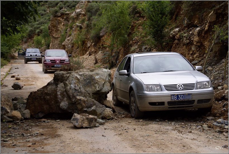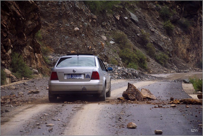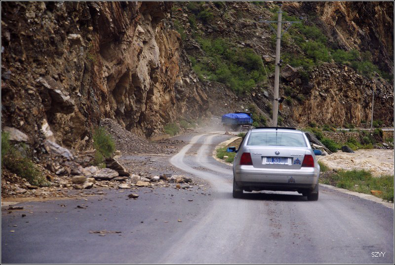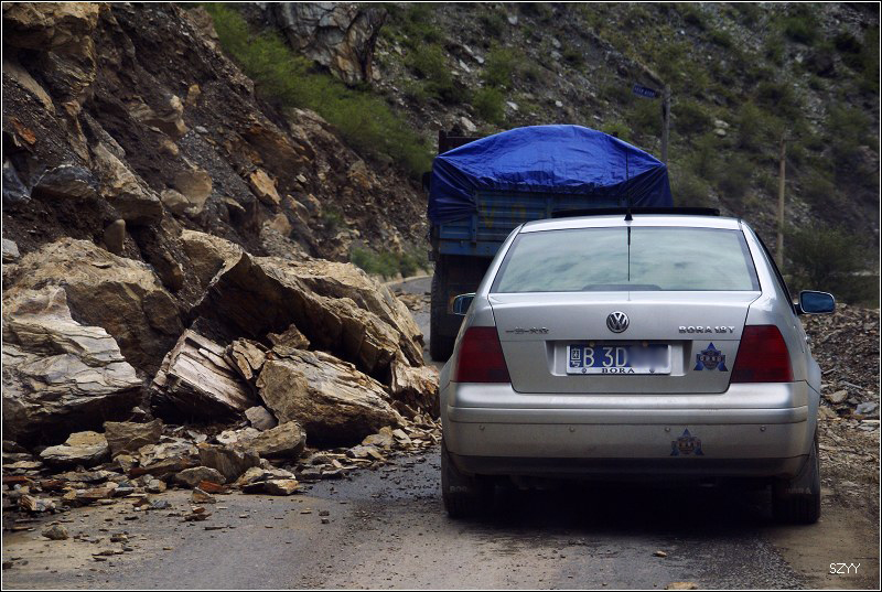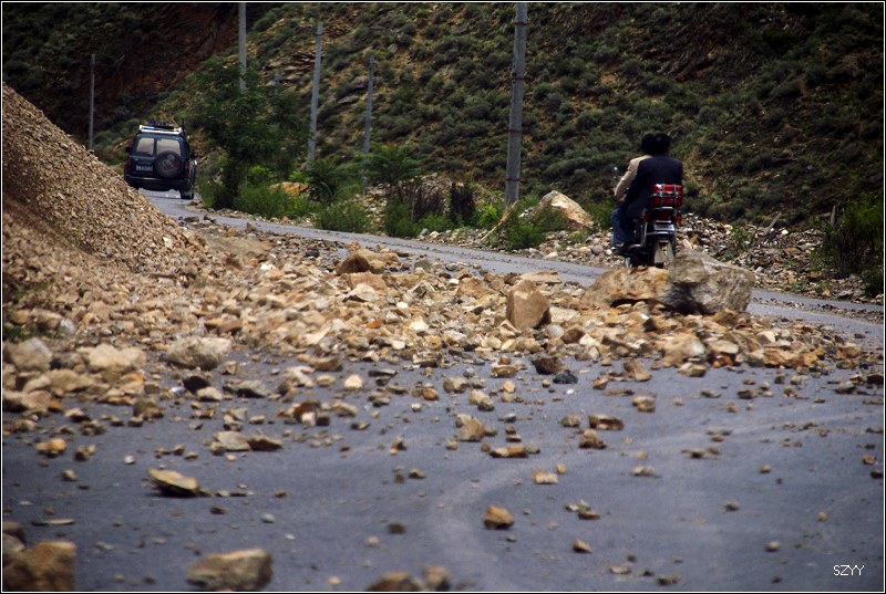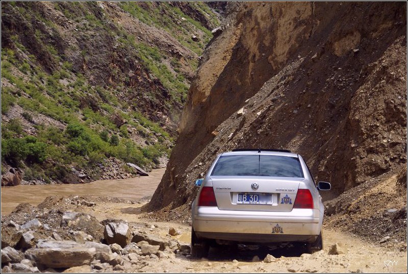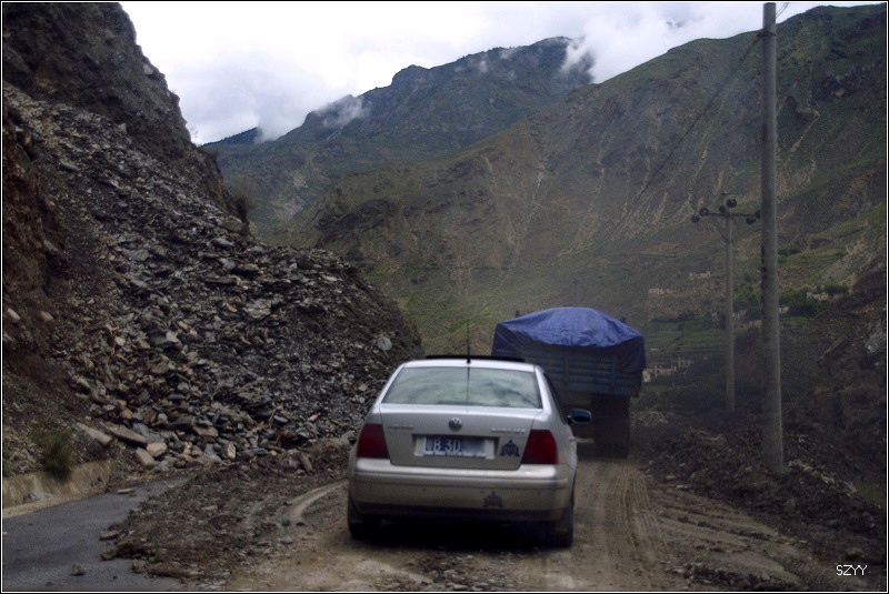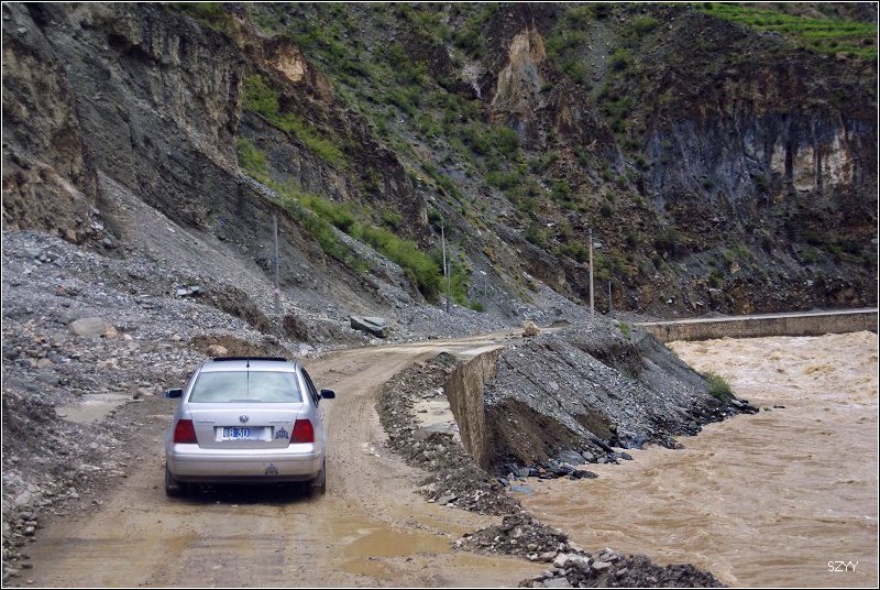 老郎开车,路面倾斜,斜向峡谷下方,四驱车的轮子也打滑,并且是侧滑,极为恐怖,一旦滑下去,可就什么都没了。开过来之后,老郎说他汗毛直竖,手心直冒冷汗。刚开过这个险段,我发现前面不远处有一大片灰土冲天而起,我心里一惊,这种雨天,不可能有那么多干的尘土,一定是前面山体滑坡了,看方向正在我们前面,万一把我们的路阻断,我们可就惨了,赶紧跟大家说,我们都紧张地盯着前面,好在我们的路在距离尘土几十米的地方向左拐了一个弯,绕了过去,向右一看,果然是半面山崩塌了下来,进入江里,这时正好看见一个小村子,村里的人包括红衣喇嘛都吃惊地张着大嘴,瞪着眼睛看着我们的方向。他们看的是崩塌的山体,看的也是我们,因为我们的车正从山崩的方向开出来,他们吃惊也就很正常了。