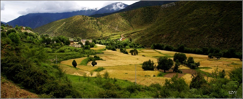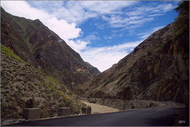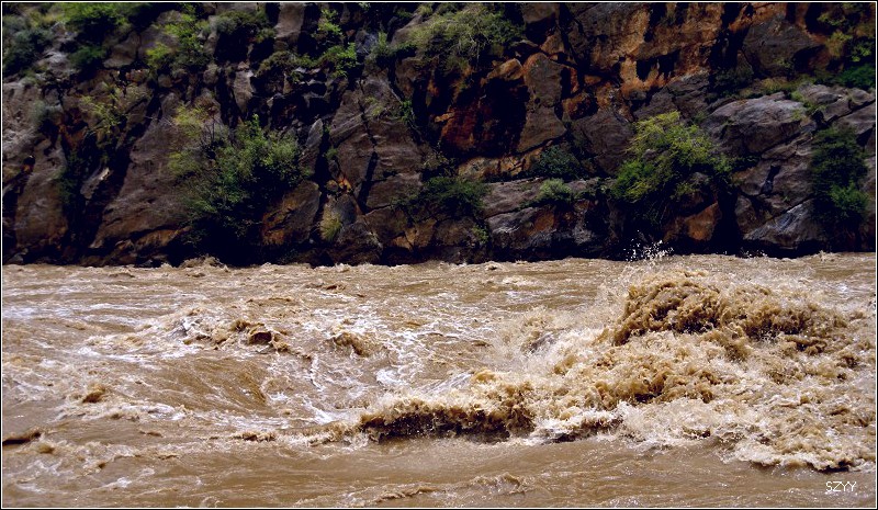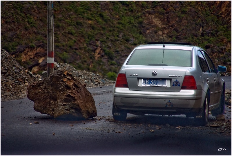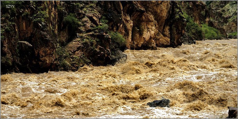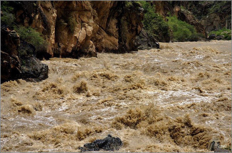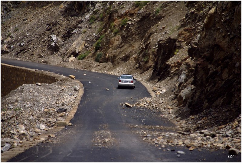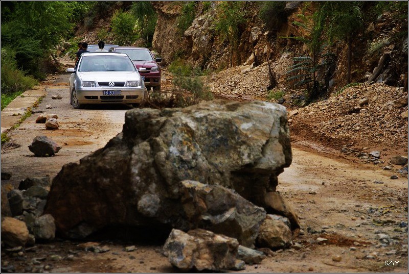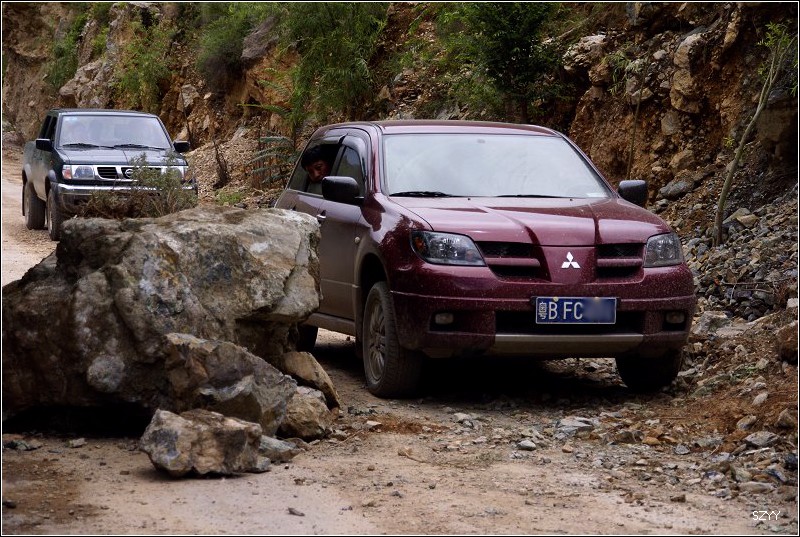 老郎开车,路面倾斜,斜向峡谷下方,四驱车的轮子也打滑,并且是侧滑,极为恐怖,一旦滑下去,可就什么都没了。开过来之后,老郎说他汗毛直竖,手心直冒冷汗。刚开过这个险段,我发现前面不远处有一大片灰土冲天而起,我心里一惊,这种雨天,不可能有那么多干的尘土,一定是前面山体滑坡了,看方向正在我们前面,万一把我们的路阻断,我们可就惨了,赶紧跟大家说,我们都紧张地盯着前面,好在我们的路在距离尘土几十米的地方向左拐了一个弯,绕了过去,向右一看,果然是半面山崩塌了下来,进入江里,这时正好看见一个小村子,村里的人包括红衣喇嘛都吃惊地张着大嘴,瞪着眼睛看着我们的方向。他们看的是崩塌的山体,看的也是我们,因为我们的车正从山崩的方向开出来,他们吃惊也就很正常了。