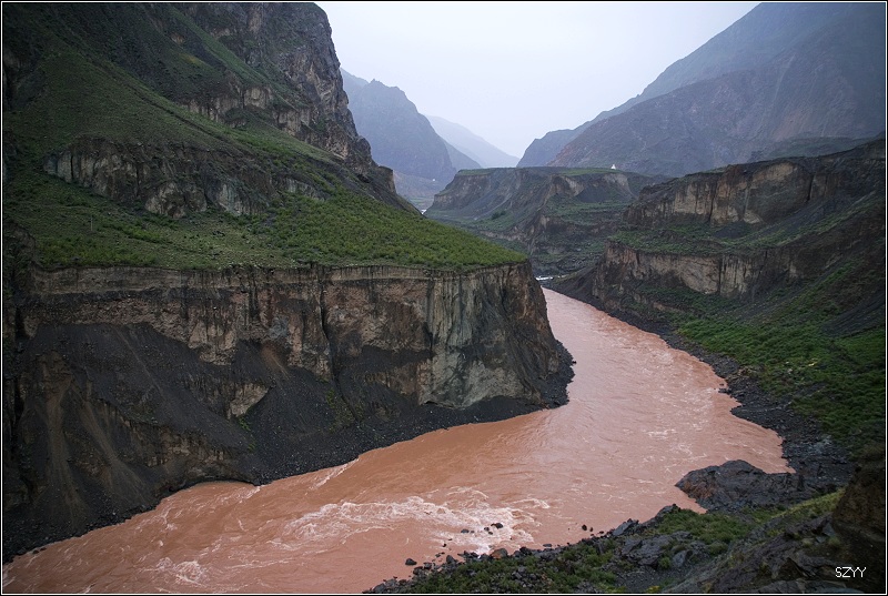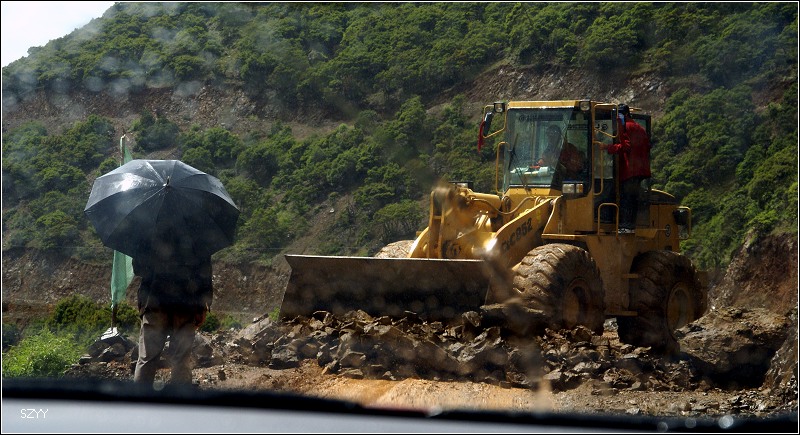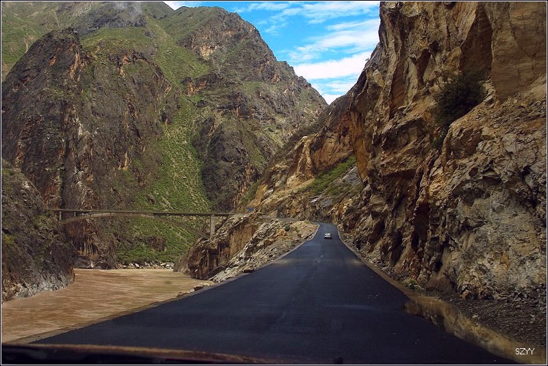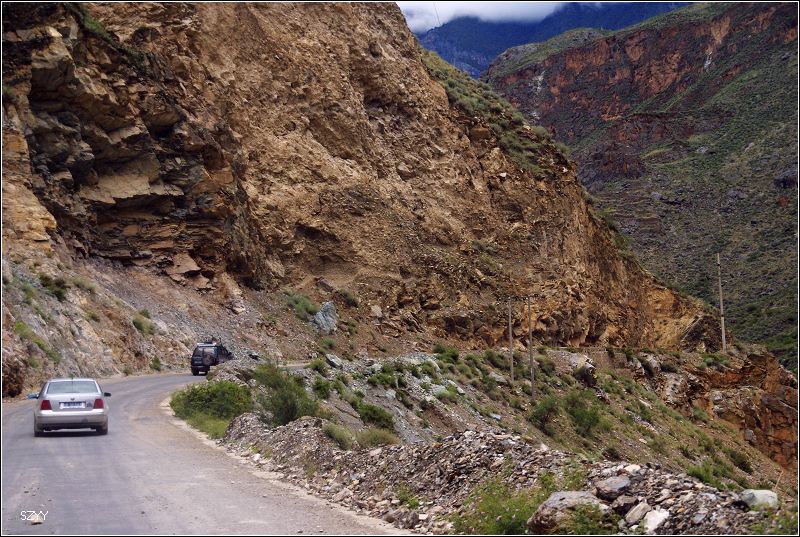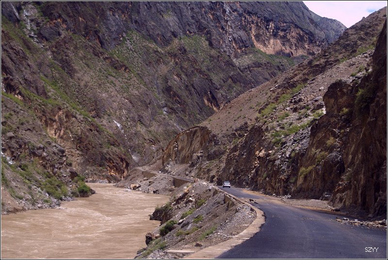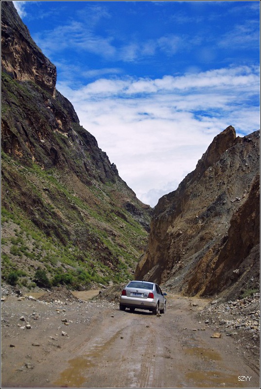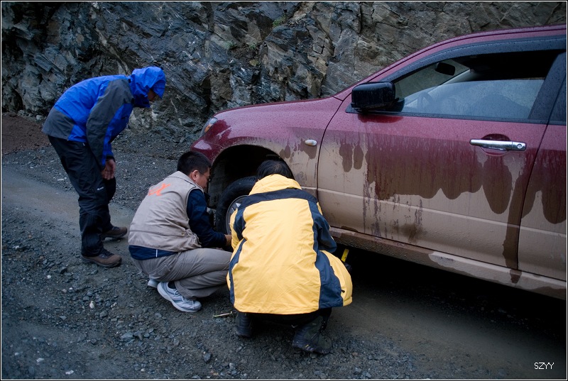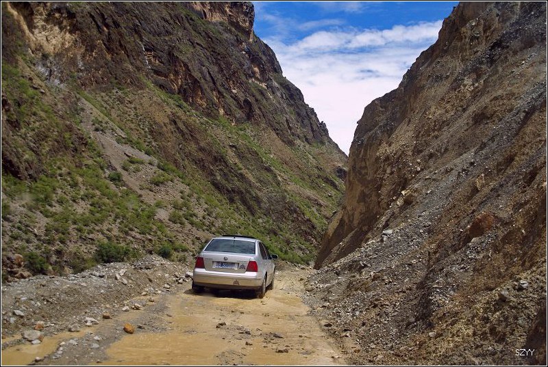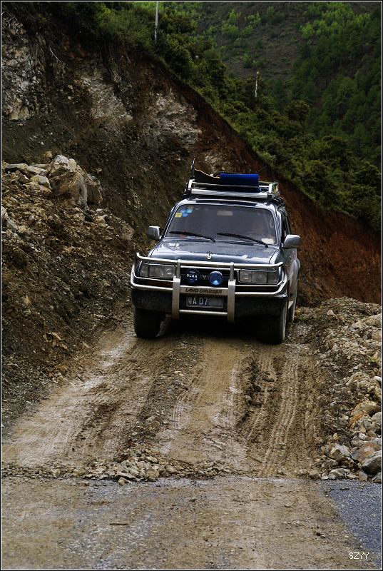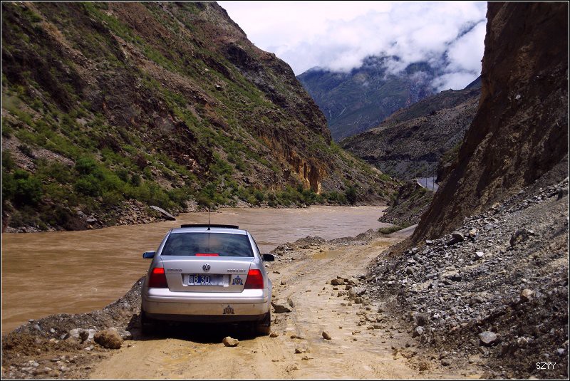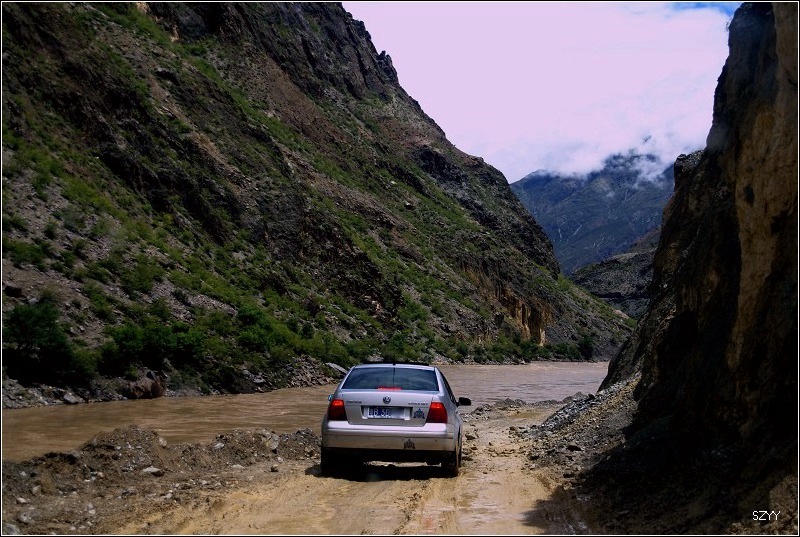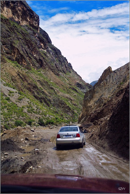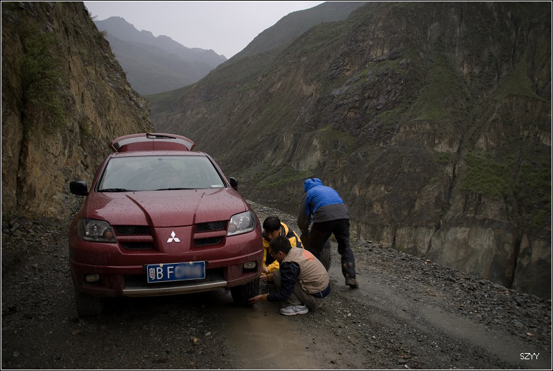 再走,又一次进入艰险路段,左侧是深深的金沙江大峡谷,浑浊的江水咆哮奔流,气势磅礴,右侧是万仞绝壁,怪石嶙峋,天下着蒙蒙细雨,泥路窄滑,可是我们实在抵御不住大峡谷的诱惑,冒险绝壁停车,拍拍峡谷的景色。老曲的车超了过去,从对讲机里说,我们的车轮胎似乎扁了,我们赶紧回头一看,不由倒抽一口冷气,果然,我们的左前胎已经完全没有气了,这可真不是时候,在这么危险的地方,山上随时会落石头,下着雨,天又马上就快黑了,怎么办?是勉强开出去找一个安全点儿的地方再换胎,可是前面看着都很危险,老曲他们的车略作停留,还是因为太危险,先开走了,达咏当机立断,决定马上换备用轮胎,大家一起动手,齐心协力,拿胎的拿胎,支千斤顶的支千斤顶,倒腾行李的倒腾行李,这时也不记得是谁了,把备用胎立着放在路上,等几个人忙着卸掉暴胎,老郎才发现,赶紧把备用胎放平了,好险啊,万一立着的备用胎没放稳,滚到金沙江的万丈深谷里,我们可就歇菜了。终于,换好了轮胎,整理好行李,可以继续前进了,整个过程历时20分钟,赶紧离开这个是非之地。