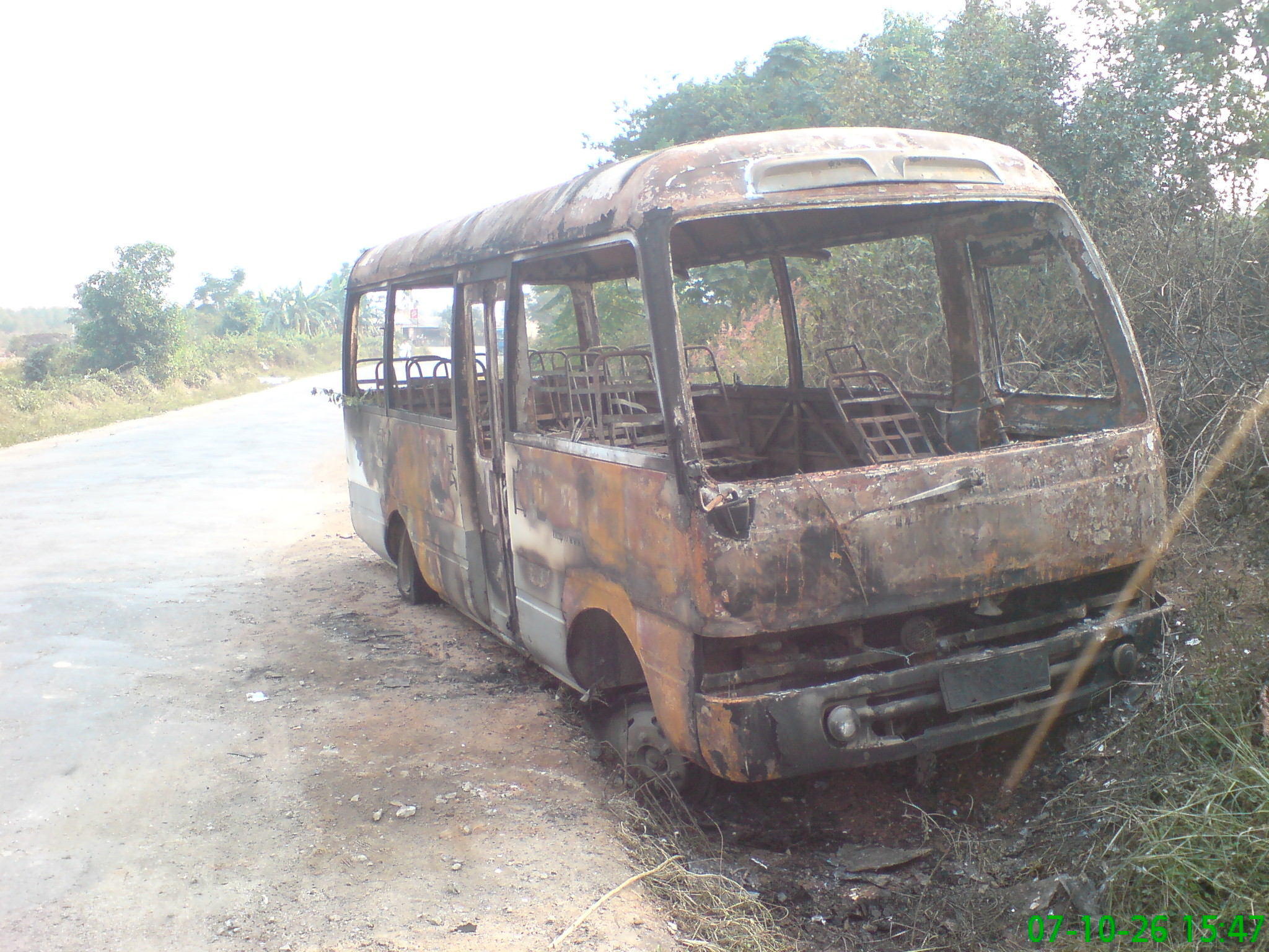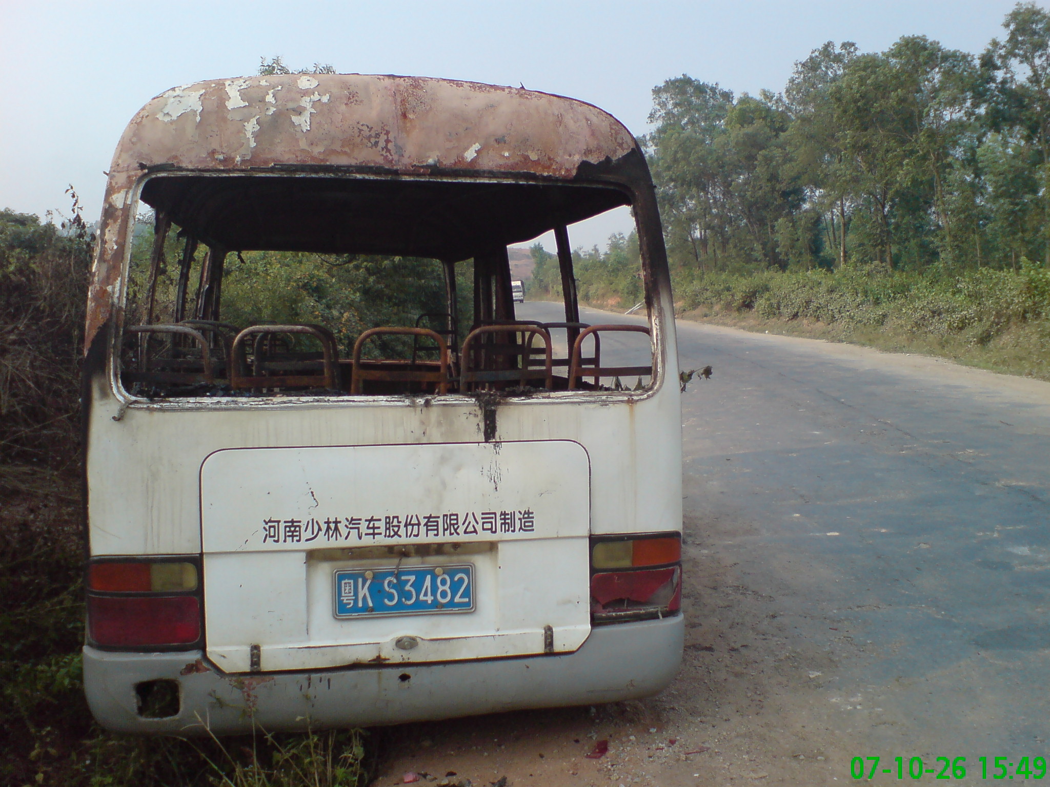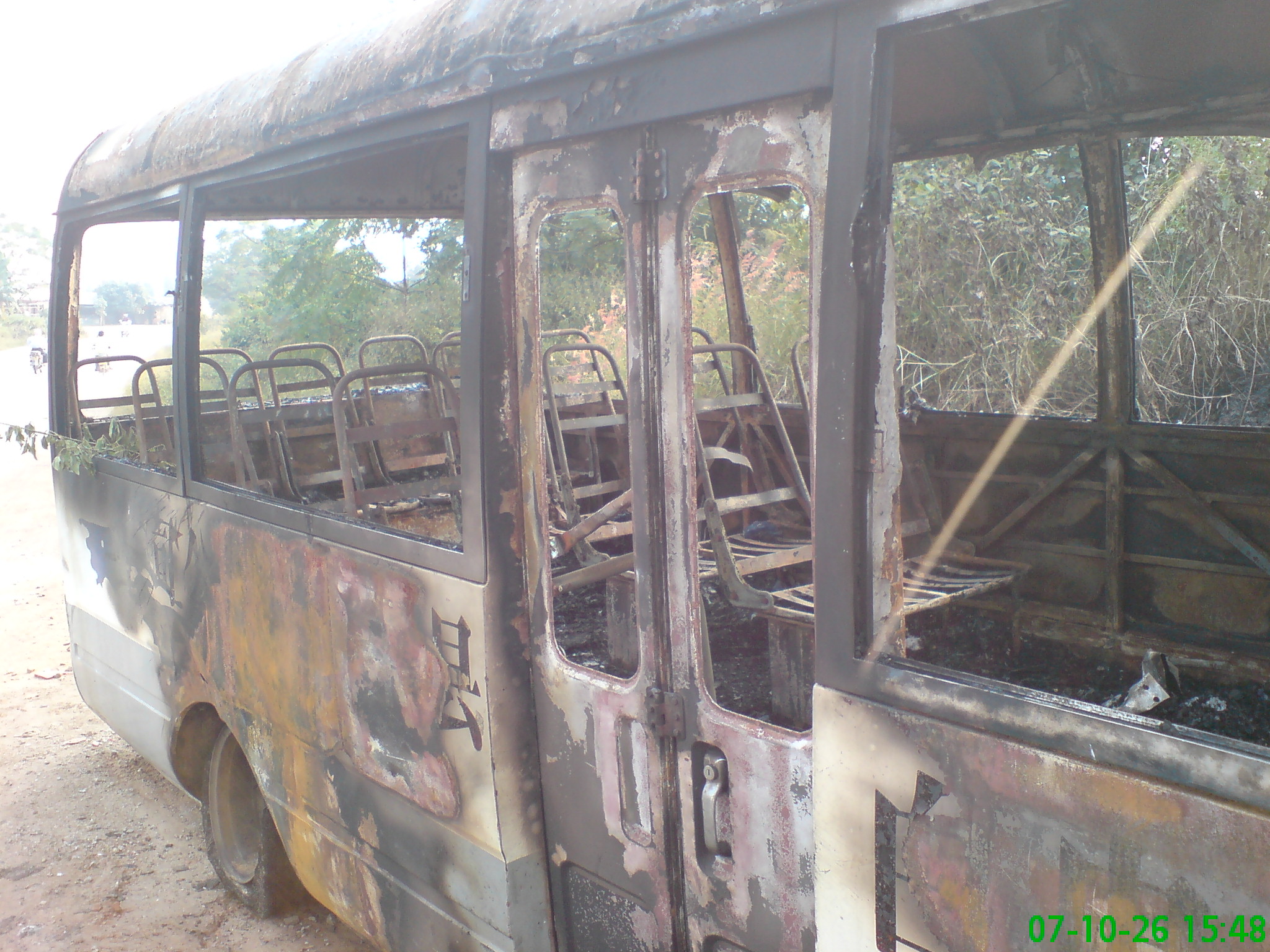 (screen.width*0.8-70)) this.width=(screen.width*0.8-70)'> 七那公路昨发生袭车事件 两辆客车被焚毁 本报记者 吴祖光 摄影报道 行驶中的客车被人截停并纵火焚烧,这一恶性袭车事件昨日下午就发生在七(迳)那(霍)公路茂港区七迳镇及坡心镇路段,事件中没有造成人员伤亡。茂港区公安、消防及交通部门紧急前往现场参与扑灭大火、维护秩序、疏导交通及勘察调查等工作。目前,有关该事件的具体情况警方正在进一步调查处理中。 昨日下午3时多,记者接报沿七那公路由南往北赶往事发现场。行至七迳镇木等村委会路口附近时,见西侧路边停靠着一辆中巴。该车已被严重烧毁,车厢内板、座椅、车壁、车顶、驾驶台、发电机等均已被烧掉或烧坏,到处一片漆黑,很多部位都只剩下一个铁架,车身外部也不同程度被烧,4个轮轱被烧穿,路旁的杂草也被殃及,被火烟熏得焦黄,四周弥漫着刺鼻的焦臭味,地面上则可见大量消防水浇洒过的痕迹。 据该车的一名当班司机称,事发时约为下午2时左右。他驾驶这辆中巴由水东开往霞洞镇,行至木等村路口附近时,突然从路边冲出4、5名男青年拦车。他以为这几名男青年是要搭车的,于是将车停下来,但其中一名男青年却冲上车叫他下车,另外的男青年则手提木棍猛击车身及车窗,车上10多名乘客见状,吓得纷纷夺门而出远离客车。他见这伙男青年如此凶恶,也只好下车,然后步行向坡心镇方向赶去,边赶边打电话报警。后来才知道车已被人纵火烧毁。 记者又沿路往北行走,来到坡心镇坡心瓷厂附近路段时,又见西侧路旁停靠着一辆中巴,同样已被烧得面目全非,仅剩下4个轮轱尚算完好。据围观者称,这是一辆由沙琅镇开往水东的客车,也是在下午2时许被几名不明身份的男青年拦停后纵火烧毁的,当时车上的乘客也吓得弃车逃离了现场。而稍前,另有一辆由沙琅开往水东的中巴在同一路段遭到多名男青年掷石袭击,车窗玻璃几乎被击烂。 据悉,事件发生后,茂港区公安、消防、交通等部门紧急出动,迅速赶至事发现场,参与扑火大火、维护秩序、疏导交通、勘查现场等工作,很快就将大火扑灭,但两辆中巴均已被严重烧毁。目前,有关事件的具体情况警方正在作进一步调查处理。(